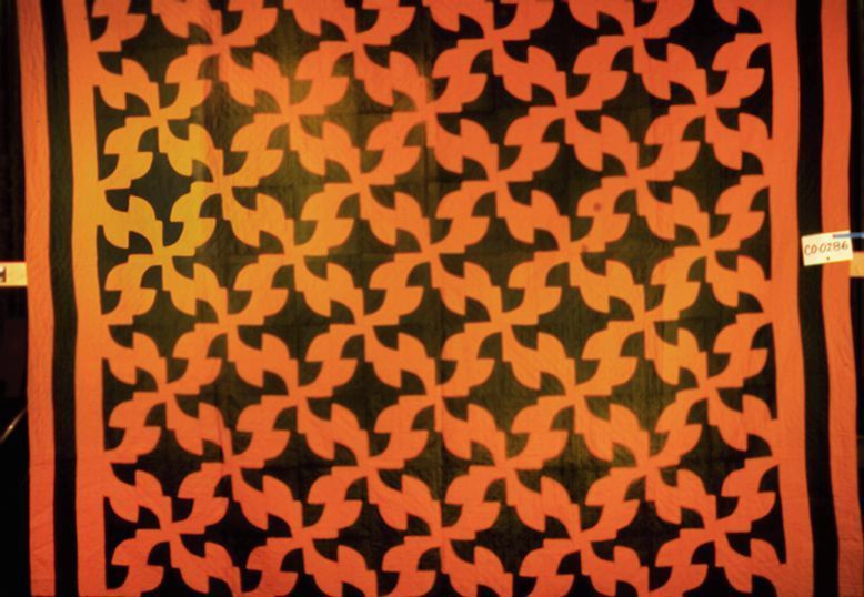 Quilt. Pieced quilt in "Drunkard's Path" pattern. 90" x 90". Hand pieced in orange and green cotton. Bordered by 3 2.5" stripes - two orange and one green. Binding is orange, bound front over back and hand stitched. Backing is rust-color print; thin cotton backing. C.1940.Acquisition