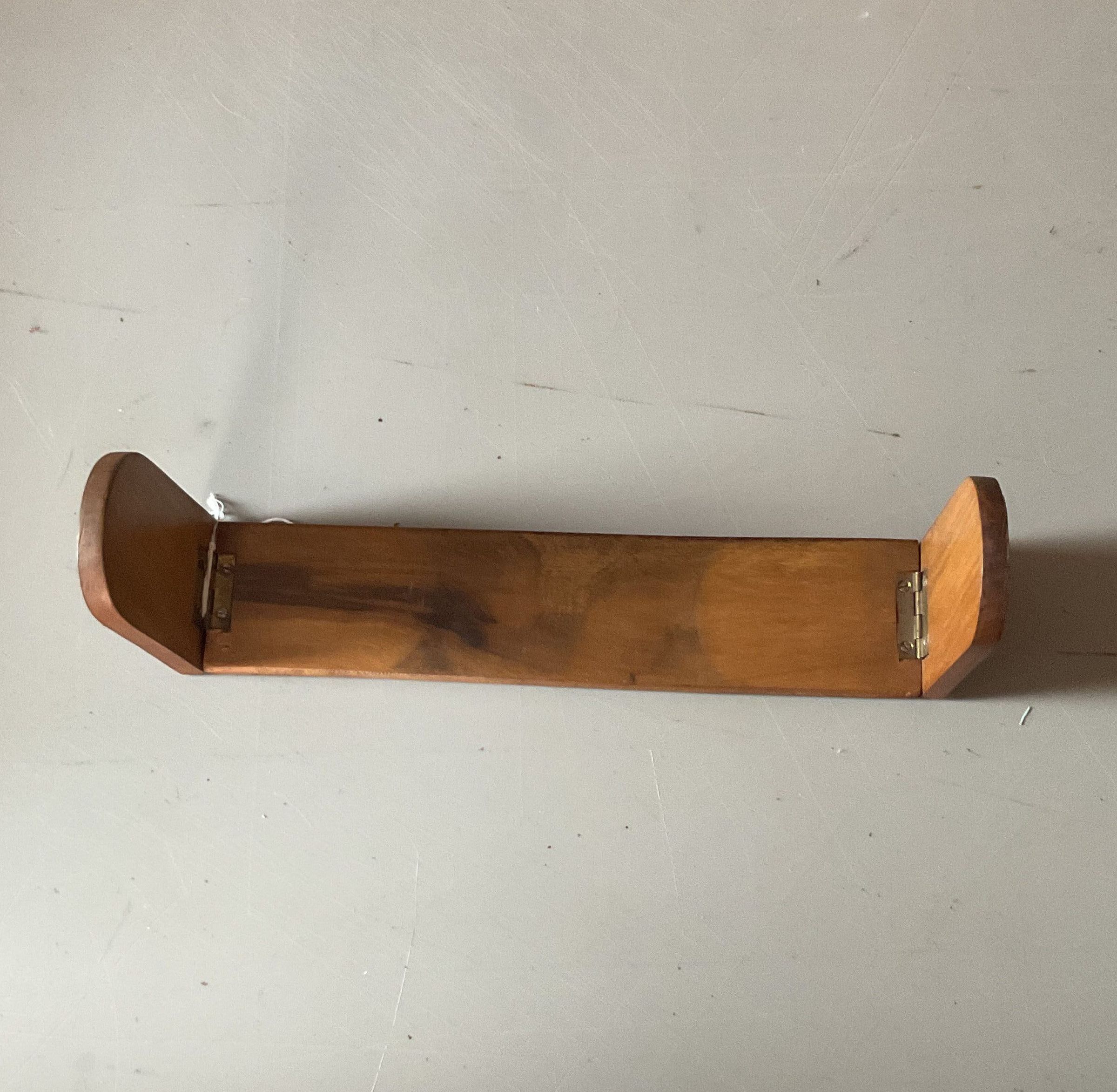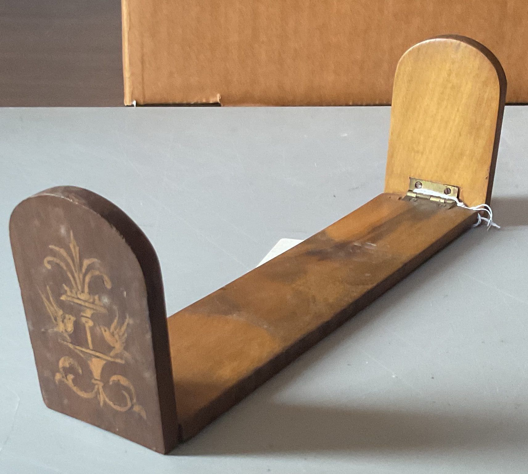 rack, book; wood base with hinged end pieces, veneered and inlaid. European. 2.875"h x 8"w x 1.75"d. C. 1875-1900.