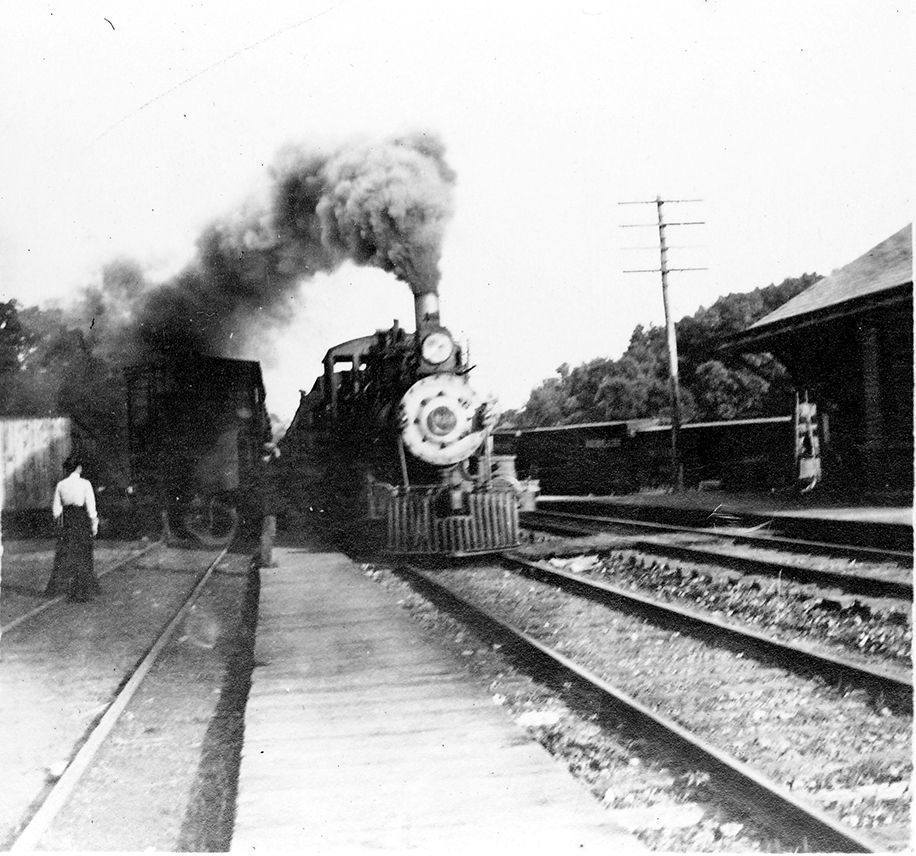 Train on a railroad pulling into a station, one woman outside. 3.5"x 3.25".