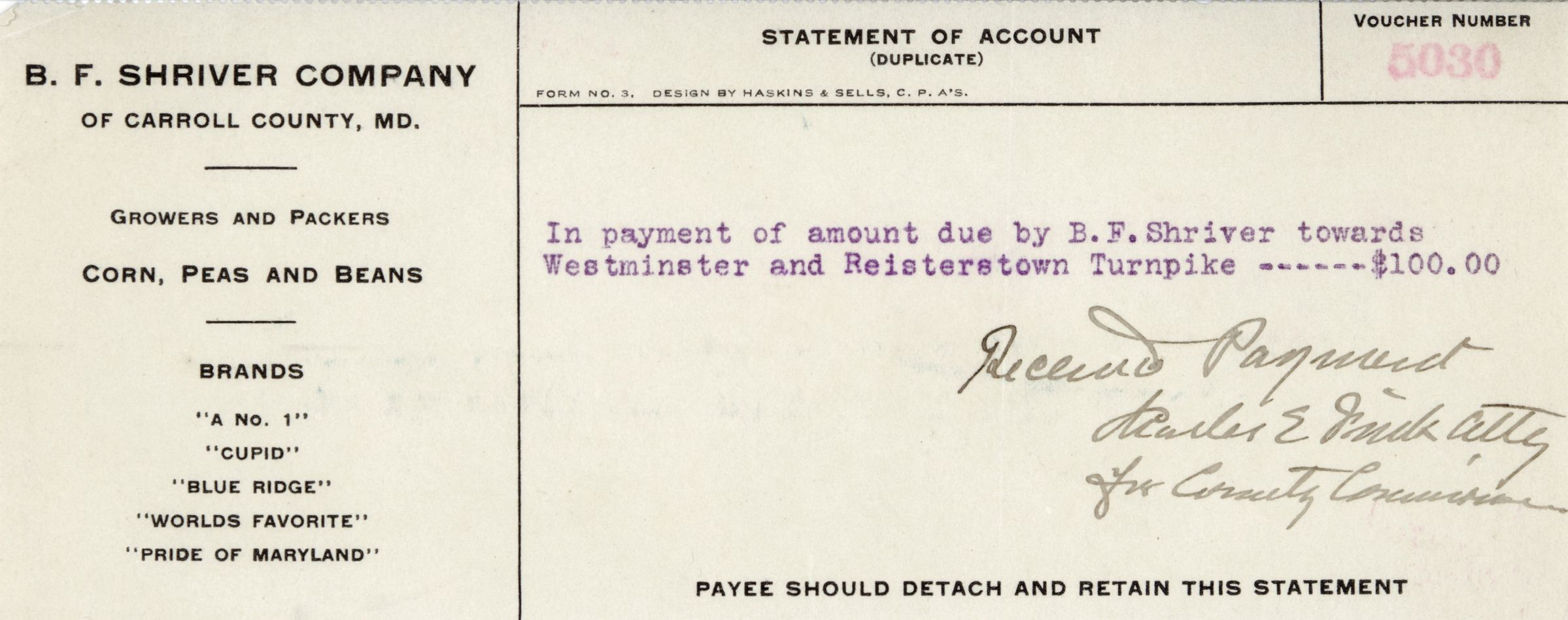 Receipt. B.F.Shriver Company for Westminster and Reisterstown turnpike, no date. White paper, black printing, 3"x 8.5".