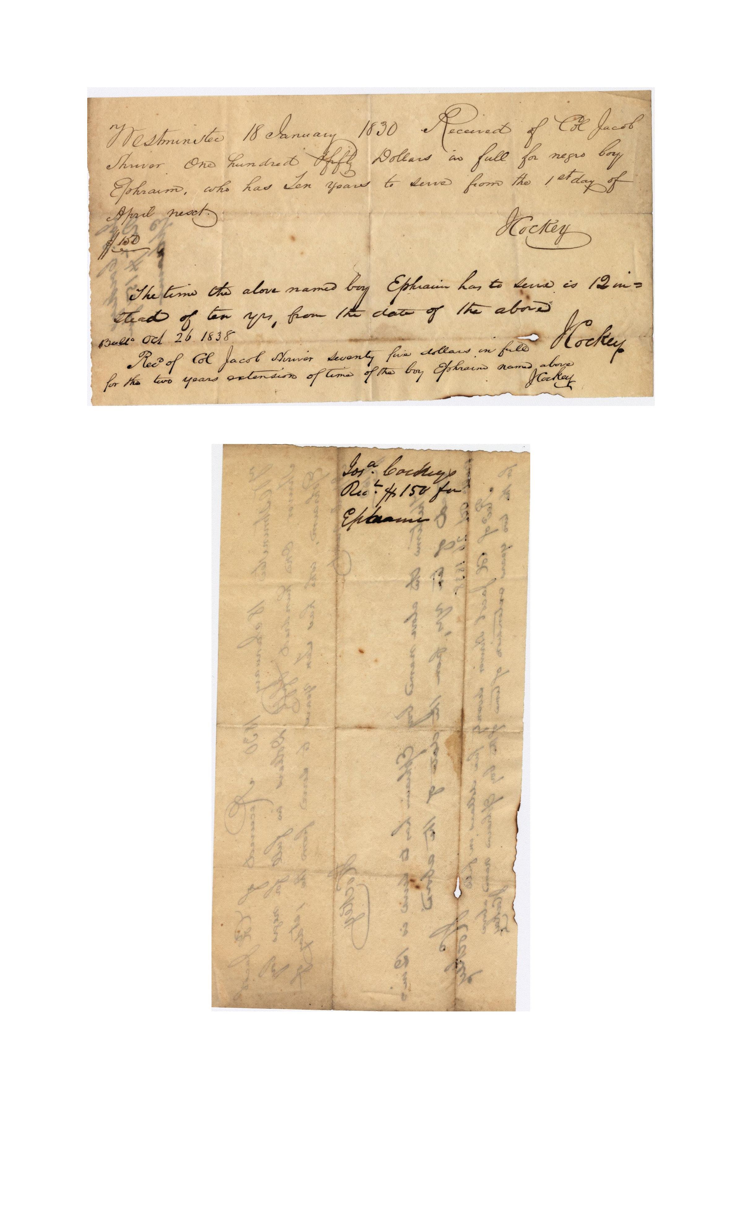 Receipt. From Col. Jacob Shriver to J. Cockey, payment for slave, Jan. 18, 1830. Correction at bottom, slave (Ephraim) has 12 years to serve, rather than ten. Handwritten, 4.5"x 8".General Notes