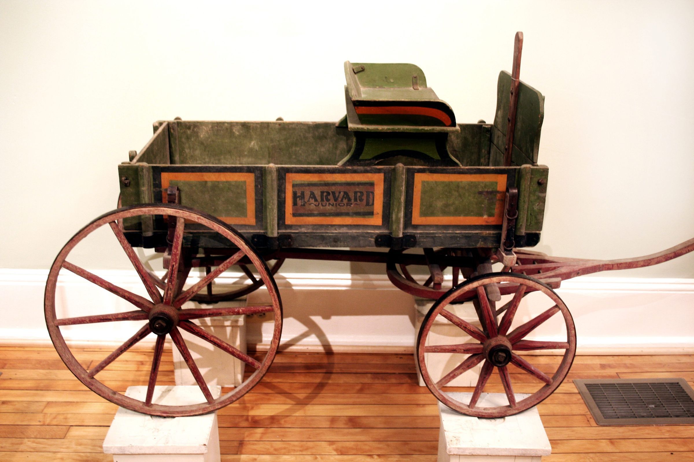 Wagon, farm. Child's wagon, probably pulled by goats or dogs. Rectangular box body on two axles; body painted light green with yellow and black rectangles forming decorative border around each side; HARVARD JUNIOR painted on both sides; hinged tailgate. Front wheels have 13.5" diameter; rear wheels have 20" diameter; iron band around wheels. Original red paint remains on axles, tongue and wheel spokes; black striping on wheel spokes. Bench seat is removable; supported by sides of body; painted same light green as body; no upholstery. Tongue extends 40.5" from front of body. Overall size: 29"h x 27.5"w x 43.5"d.Acquisition