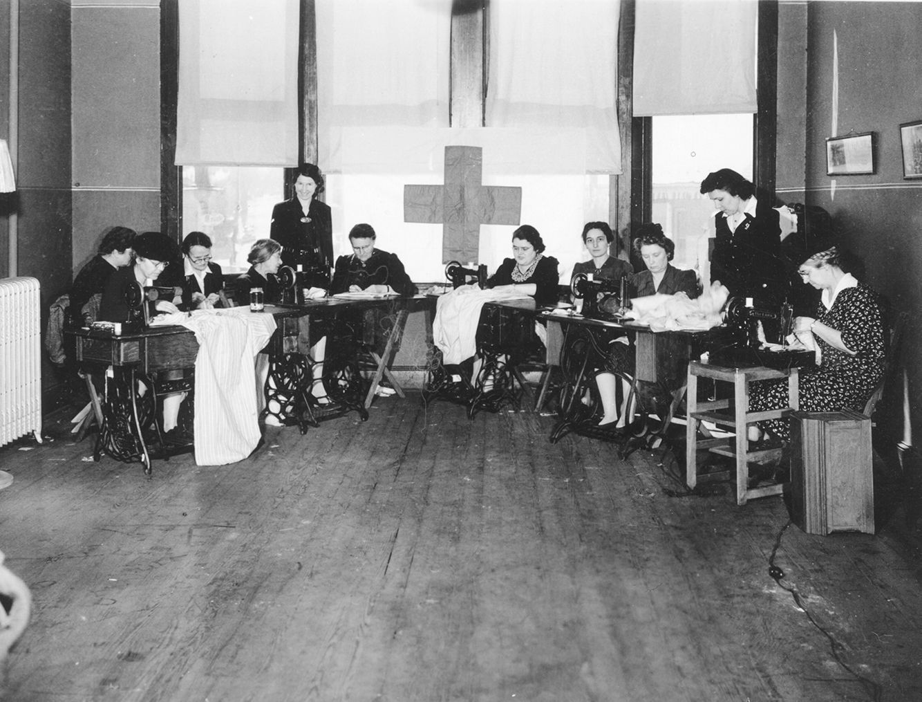 Print, photographic. B/W photograph showing a group of women in the Red Cross sewing. World War II. Crop marks on front. Back reads: "Use for Newspaper publicity - E.J. Mather".Acquisition