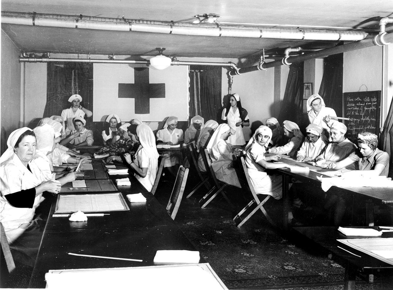 Print, photographic. B/W photograph of women in the Red Cross cutting gauze for bandages. World War II.Acquisition