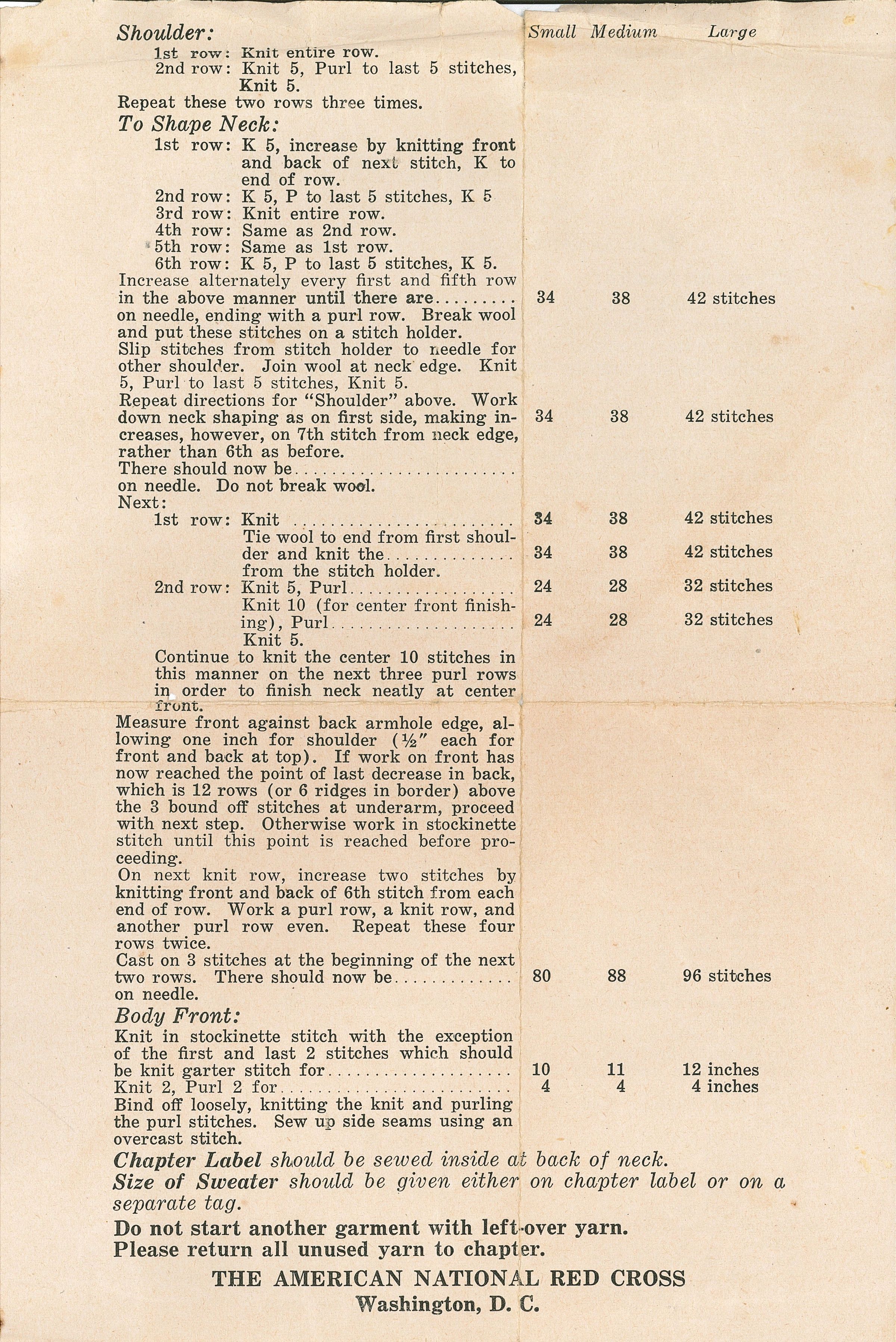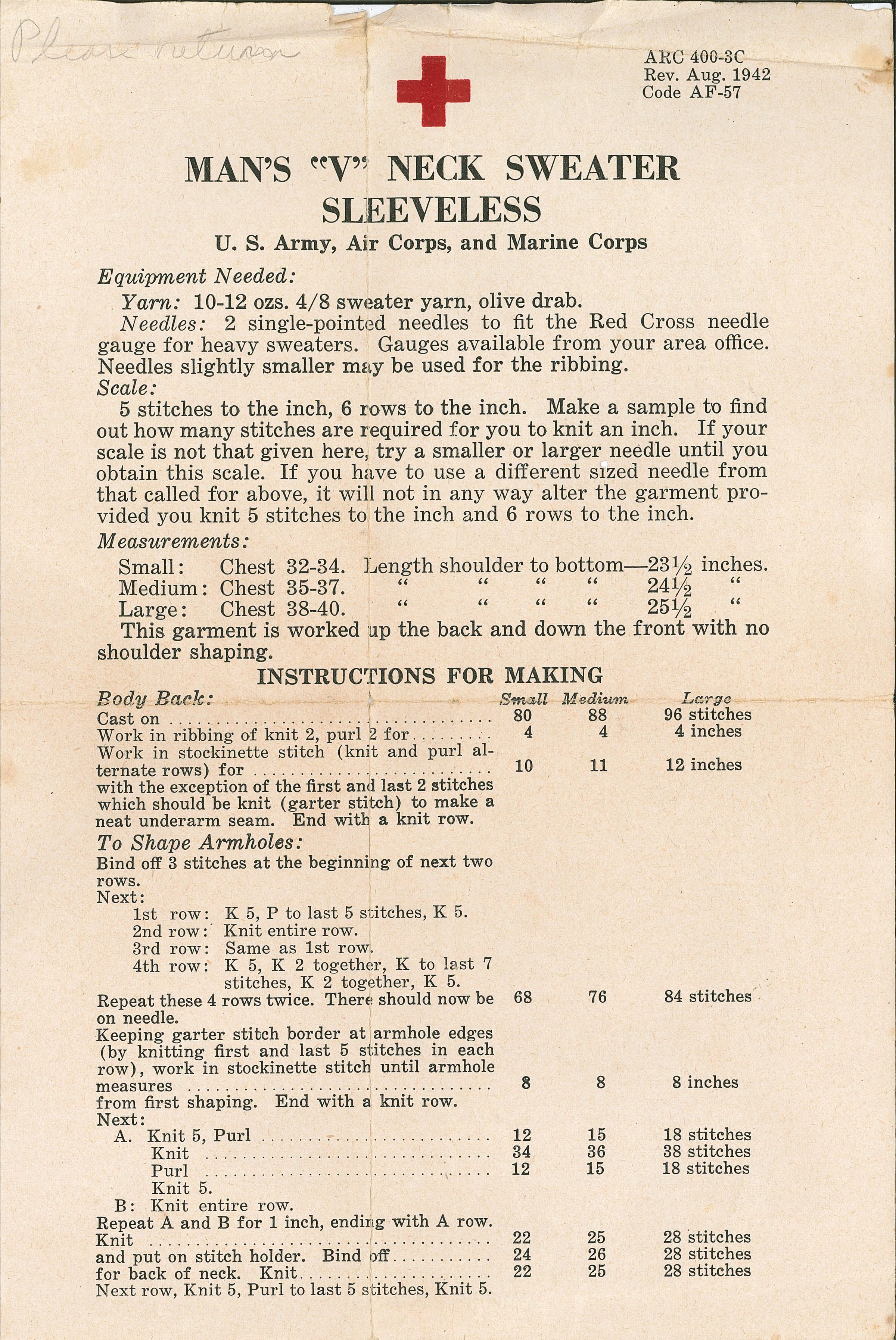Knitting instructions published by the American Red Cross for "Man's 'V' Neck Sweater Sleeveless" in 1942. 2-sided, 6"x9". Envelope addressed: