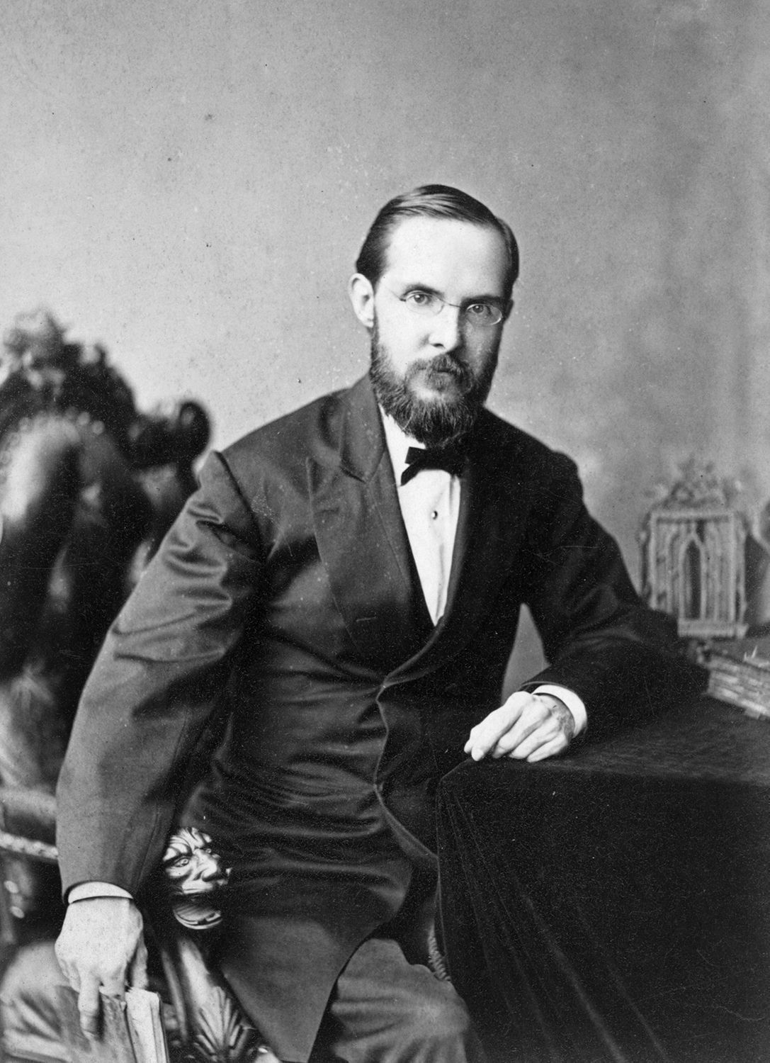 Photograph, cabinet. Image of James W. Reese by photographic studio N. H. Busey, Photographic Art Gallery, Cor. Charles & Fayette Sts., Baltimore. Reverse side labeled "Prof. James W. Reese." Undated. Three-quarter length pose of man seated in upholstered chair with left arm leaning on a table and right hand holding a book. He wears a coat and tie, has mustache and beard, also glasses. 6.5" x 4.25".Acquisition