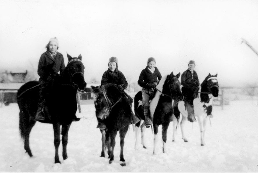 Print, photographic. B/W snapshot taken at the Ralph Reifsnider farm, on Fairground Hill, Westminster, c.1935. Winter, shows four people on horses. Written on back is "Right - Left Pony Boy - Frank Ruppert Petty Girl - Floyd Dull Tiny Tim - Kenneth Perry Capermaum - Sylvia Irwin". 2.5" x 3.5".Acquisition