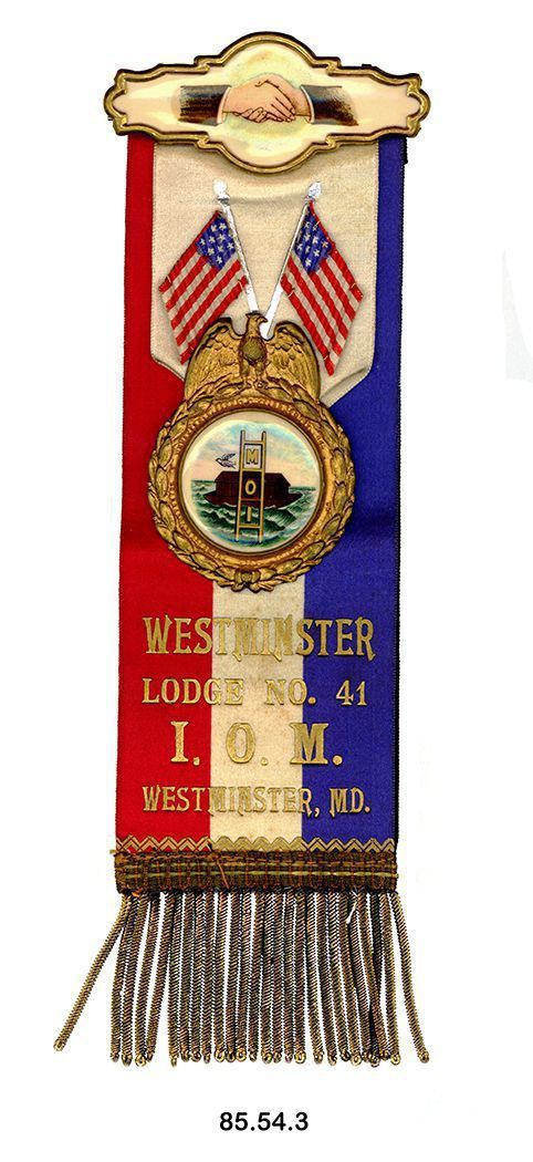 Ribbon, fraternal. Independent Order of Mechanics. "WESTMINSTER LODGE NO. 41 I.O.M. WESTMINSTER, MD." Silk ribbon with red, white and blue vertical stripes, gold lettering. Gold fringe at bottom. Across top is bar with brass frame; celluloid panel at center has image of two hands clasped in handshake. Suspended from bar, overlaying striped ribbon, is white silk ribbon; appilqued with two crosed American flags; suspended medallion with gold color frame with eagle at top; center medallion has image of a houseboat. Reverse is black silk with silver lettering. Reads "In Memoriam WESTMINSTER LODGE NO. 41 I.O.M. WESTMINSTER, MD." Has same image as on round medallion on front. 9.125"h x 3"w. In paper envelope from THE HYATT MFG. CO., Baltimore & Holliday Sts., Baltimore. "Name of Owner", written in pencil - Adam J. Martin. "Name of Society", written in pencil - I.O.M.Acquisition