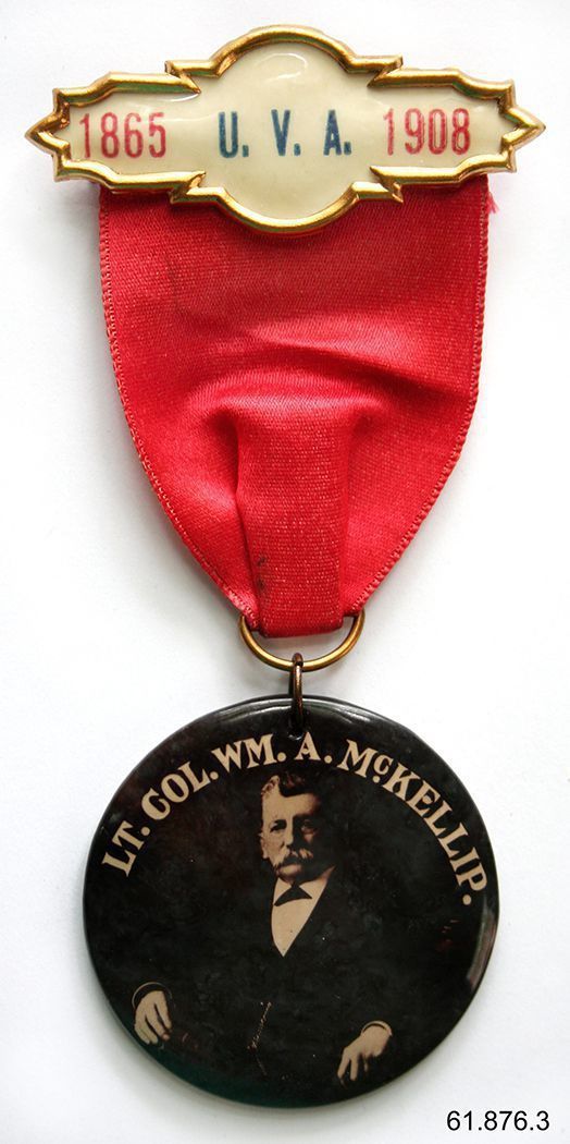 Ribbon, fraternal. Union Veteran Association. Gold color bar with celluloid center panel; marked "1865 U.V.A. 1908". Suspended from this is red silk ribbon. Suspended from ribbon is medallion with picture of William McKellip, marked "LT. COL WM. A. McKELLIP", reverse of medallion is white with black lettering "43RD Annual Reunion OF THE UNION VETERAN ASSOCIATION of Maryland 1908." 4.5"h x 2.125"w.Acquisition