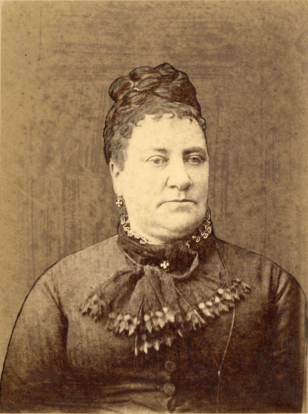 Print, photographic. Emily Jane Wampler Grammar Rhinehart Rippard. She wears a dark dress with a scarf tied at the neck. The photograph is mounted on a cream mat board with a gold line going around the window. The maker's marks appear in the bottom corners of the mat, "Rhoads, Photo. 1800 Frankford Ave." Inscription on the back in pencil reads, "Emily Jame Wampler- Grammer Rhinehart- Rippard". Blind stamped "COPY". Retouched. Overall measurements 12" x 10"; image size is 8" x 6". C. 1890.Acquisition