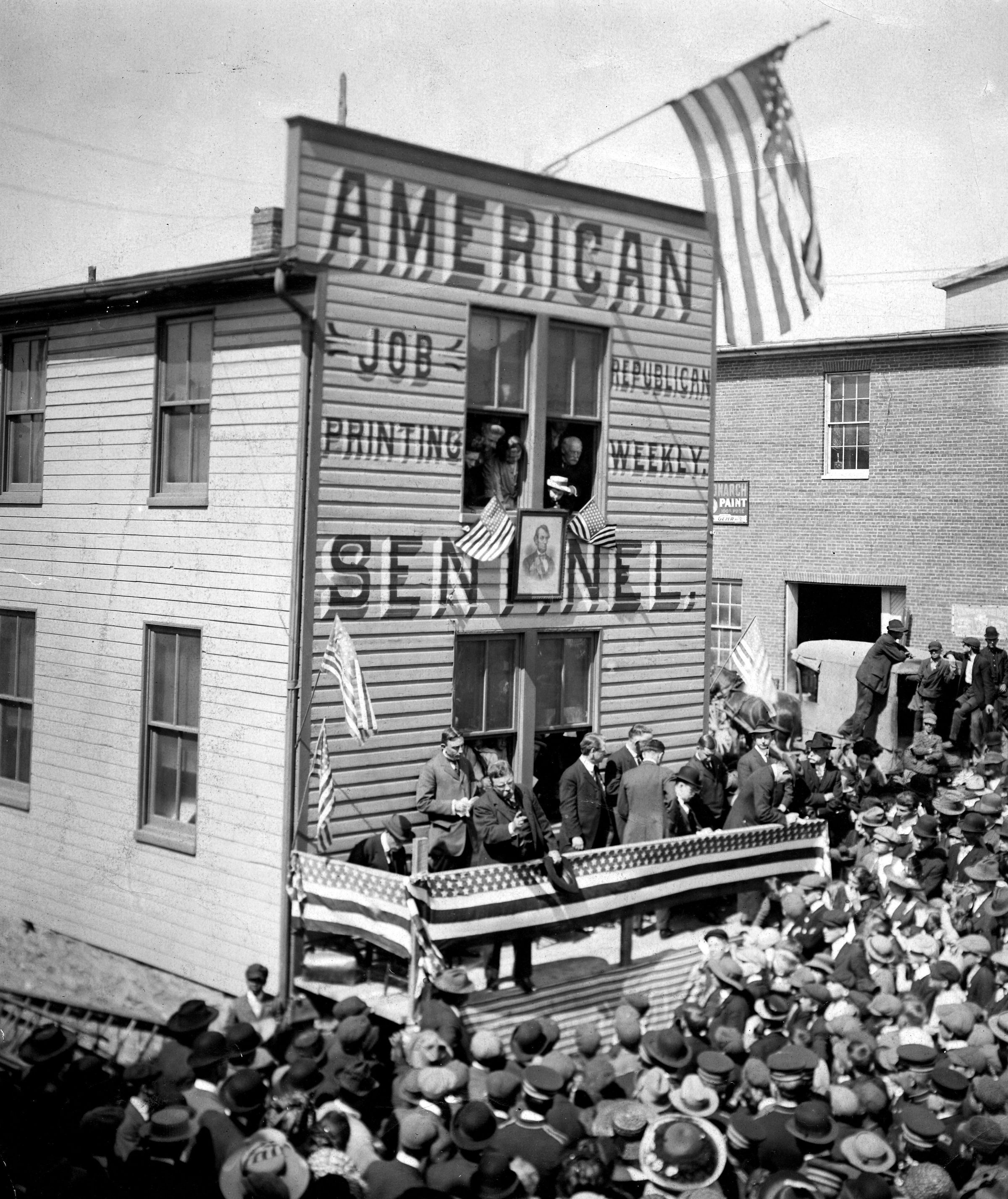 Print, photographic. B/W silver gelatin print, 10" x 8". Shows the front of the American Sentinel building; a group of men stands on platform in front of building, railing of platform is draped in bunting; President Theodore Roosevelt is speaking at lower proper right. Six people are watching from windows above platform. Written on back is "President Roosevelt (Teddy) speaking at Westminster, Maryland. Leaning from window - Mary Bostwick Shellman and Mrs. Joseph W. Brooks. On platform: Mr. Joseph W. Brooks Editor of the 'Sentinel'. "Acquisition