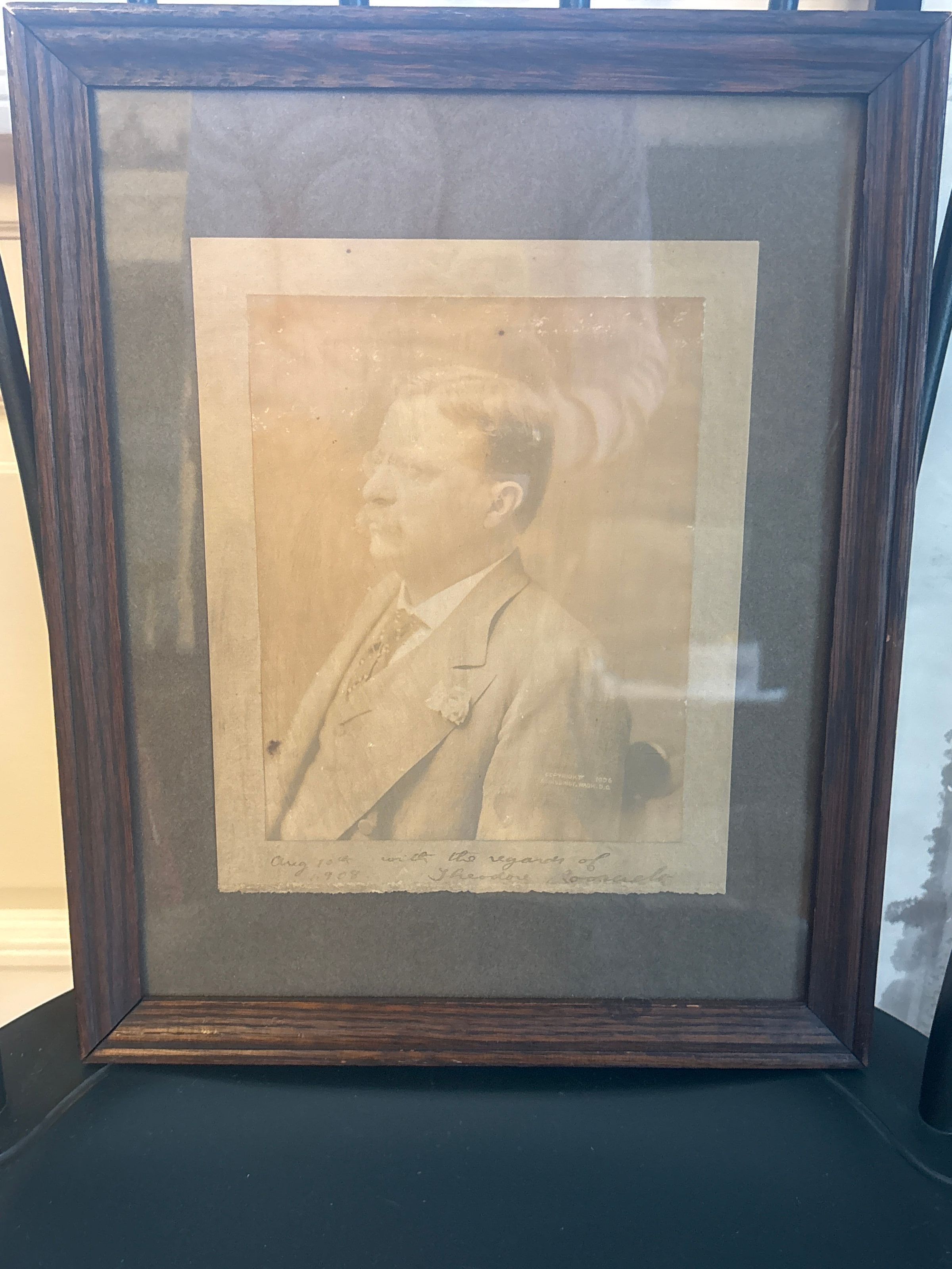 Framed sepia photograph of President Theodore Roosevelt. Signed “Aug 10th 1908 with the regards of Theodore Roosevelt”. The back reads “Presented to John H. Mitten Circa 1908”.