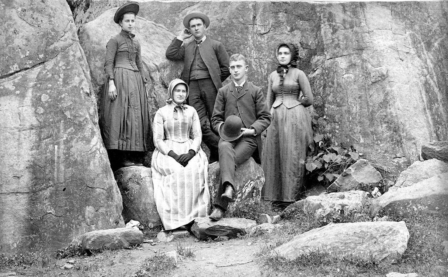 Print, photographic. Group portrait, Devil's Den, Gettysburg, Pa. Ada Royer Cookson (donor's mother), standing, top left; Charles Royer (donor's uncle), seated. Others unidentified. Mounted, c.1890. Marked "Mumper & Gelbach, Photographers, Devil's Den, Gettysburg, Pa."Acquisition