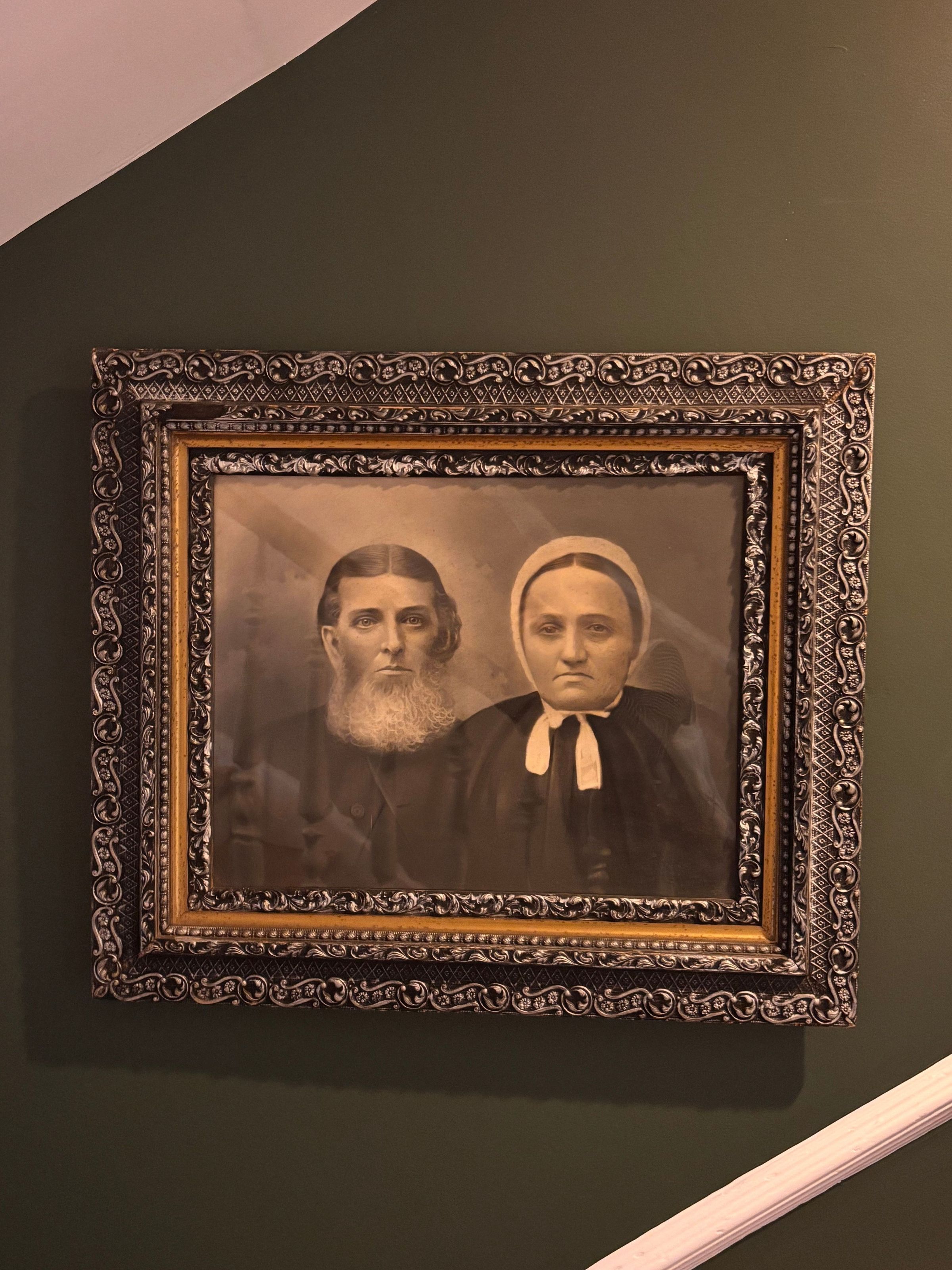 Print, photographic. Photographic and charcoal portrait on canvas of Jonas (b.1838 - d.1920) and Mary Lou Royer (b.1836 - d.1922). Inscribed in pencil on reverse "For Rachael Garner 4928 Fox Dr. Annandale Va 22003" and "Your Grandparents on you mom's side Jonas & Mary Lou Royer." Mounted on stretcher. Rectangular wood frame, painted black with silver highlights on raised ornate decoration. 24.25"h x 28.5"w x 2"d.Acquisition