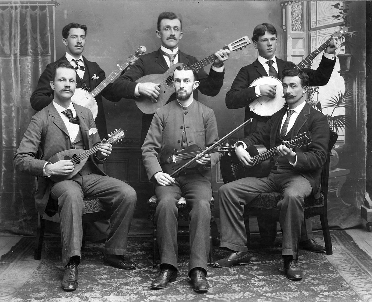 Black and white photograph featuring six musicans in a parlor setting. Front row, left to right: Grant Hiltebridle, Professor Royer, “Doc” Hyde. Back row, left to right: Hattie Hyde, Howard Englar, Herbert Getty. The photograph is mounted on a cream mat board, with the maker's mark on each of the bottom corners, "J.W. Baldwin- Westminster, MD".