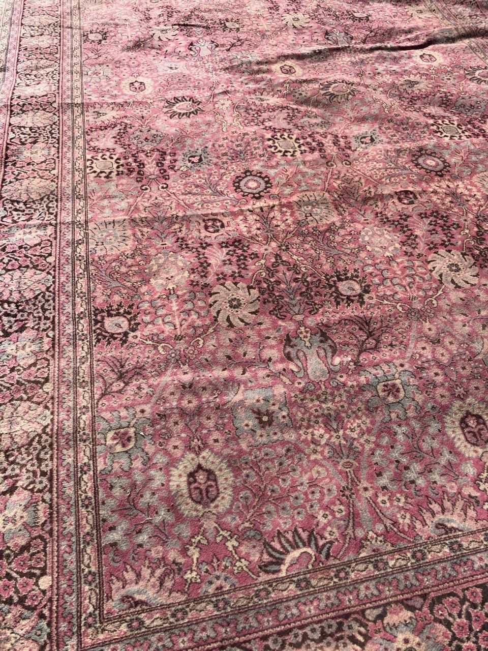 216"h x 106"w. Wool, woven. Pink/blue/black symmetrical abstract designs. Possible Persian Kashan.
