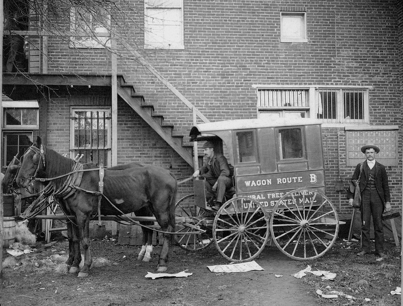A two horse wagon driven by one man labeled "Wagon Route B. Rural Free Delivery, United States Mail". A man with a postage bag is standing near a small grouping of post boxes. 7.25" x 9.5" on a 10"x 14" black backing/frame.