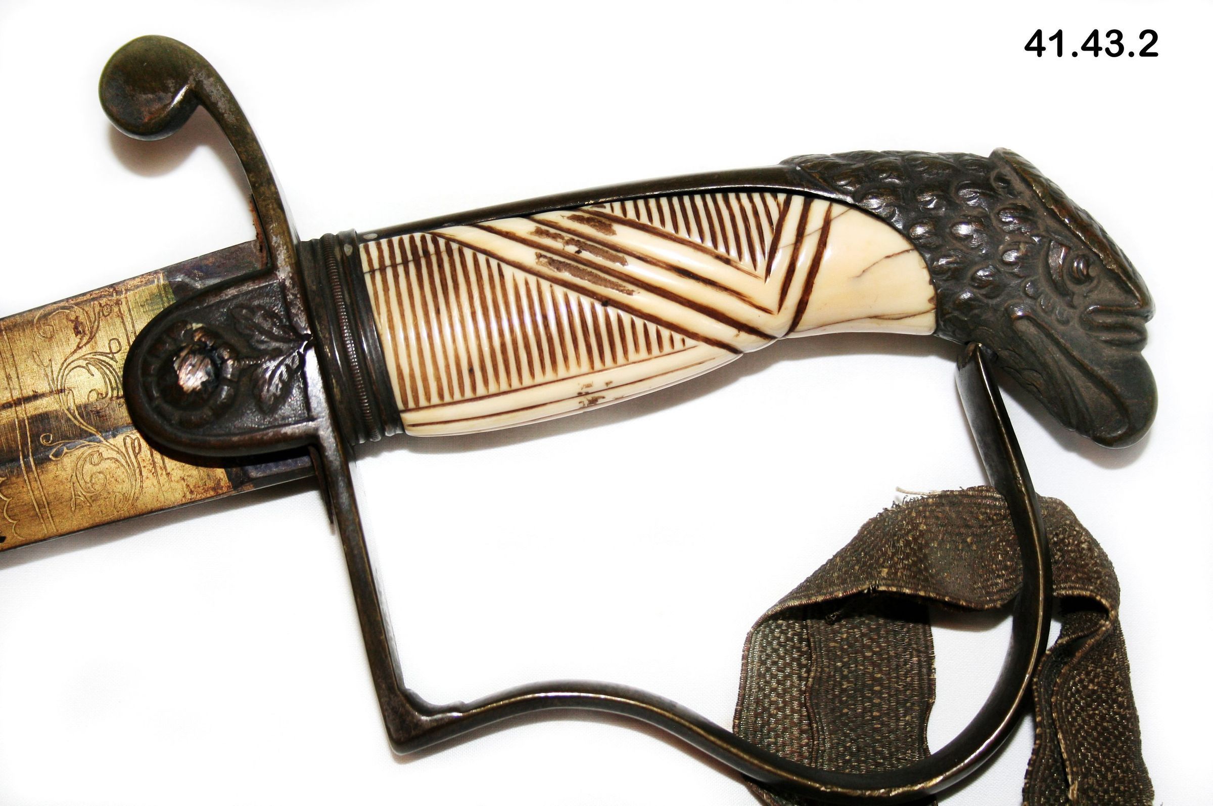 Saber. Used by Philip Jones III, (1780-1838) possibly French, c. 1810-1820. A: Saber. 37.5"h x 5.25"w x 1.25"d. Curved 34" blade is single-edged with a rudimentary false edge extending back 9.5" from the point. A very broad fuller begins after a .325" ricasso and runs to a point 4" past the beginning of the false edge. The blade is ornamented in gilt etching with floral sprays above "WARRANTED", an American eagle with a shield enclosing 17 stars beneath a ribbon bearing the inscription "E. PLURIBUS UNUM" and ending with a scroll. The reverse is similarly decorated with floral sprays and military trophies. The anterior half of the blade is blued, ending in a decorative scroll. The blade has been sharpened. The eagle head pommel with backstrap, the reverse P knuckle bow with [missing word], langets embossed with a flower, and the ferrule of cast brass [missing word?] retain some original silvering. The ivory grips are shaped to fit the hand and are carved with decorative lines. B: Scabbard. 32.75"h x 2.25"w x 0.75"d. The leather scabbard retains its silvered brass mounts with scalloped edges; there is no drag. The silvered sword knot is original.Acquisition