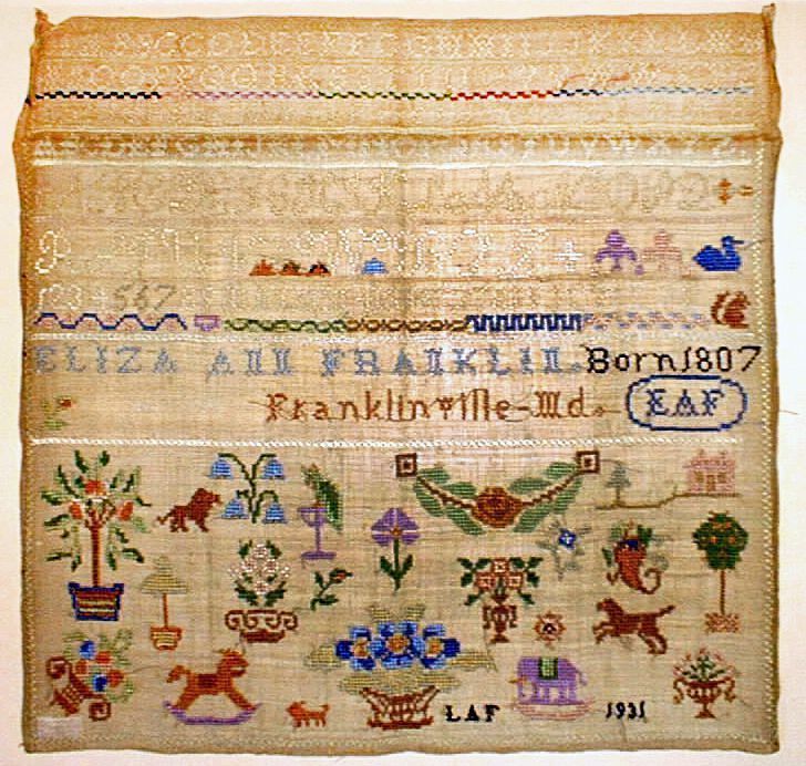 Sampler. A: Alphabet sampler, natural linen ground. Upper half has 3 alphabets stitched in cotton threads in shades of brown. "Eliza Ann Franklin Born 1807 Franklinville, Md". Lower half is pictorial with flowers and animals in bright modern threads in blues, greens, purples and browns. Marked "L.A.F, 1931" in black at lower proper left corner. 17.5" x 17.5". B: frame, wood with concave molding; 18.25"h x 21.5"w x 1.5"d.Acquisition