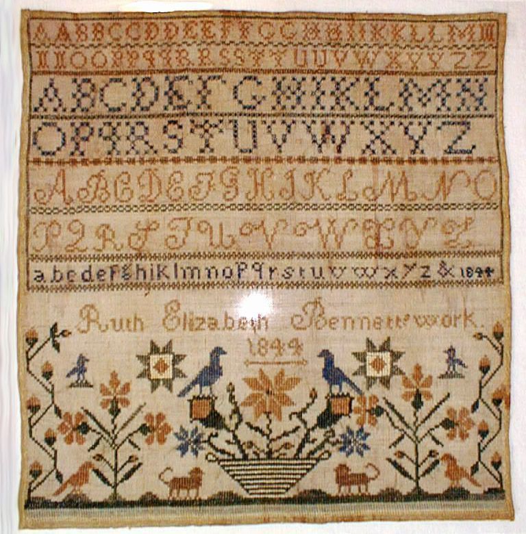 Ruth Elizabeth Bennett (b.12 July 1830, in Baltimore [now Carroll] County - d.18 Nov. 1901) married Dr. Francis J. Crawford (b. 1 Nov 1819 - d. 18 March 1885) in Carroll County, 19 May 1853. They had seven children, five of whom survived childhood: Fannie Bell (Mrs. R.O.D. Warfield), Kate Emma (Mrs. Henry S. Davis), Francis Albert, William Lloyd and Charles Clement. Ruth and her husband are buried in the cemetery at the Taylorsville U.M. Church. Her parents, Benjamin Bennett (b. 6 Sept 1785 - d. 21 Dec1834) and Polly Mitchell (b. 29 Sept 1788 - d. 11 May 1836), died in Baltimore County, leaving Ruth an orphan at age 6. Benjamin and Polly are buried at Salem United Methodist Church cemetery; their tombstones were carved by Sebastian "Boss" Hammond. Was loaned by Lola B. Crawford for "Sampling the ABCs" exhibition in 1982. Sampler purchased at auction at T.R. O'Farrell, Inc. on 19 May 2003. Was in modern frame; label on frame read "Custom Framing by The Camera Shop, Westminster, 848-8481; modern frame and mat have been discarded.