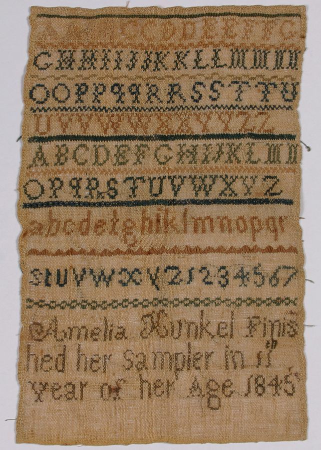 Sampler. Alphabet sampler. Natural linen; cross, flat and cat stitches in green, blue, brown and tan. 3 alphabets, each in a different stitch; one set of numerals 1 through 7. Signed "Amelia Kunkel finis hed her sampler in 11th year of her age 1845". 13" x 8".Acquisition