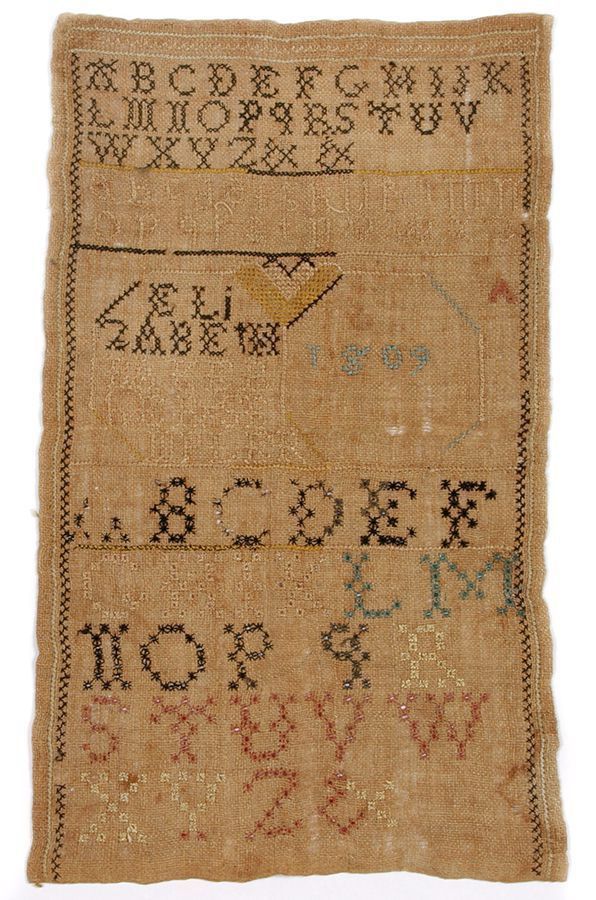 Sampler. Alphabet sampler. Natural linen with cross and eyelet stitches in black, yellow, blue, tan and red. 3 alphabets; stitched border. Signed "Eli zabeth Baker 1809". 13" x 8".Acquisition