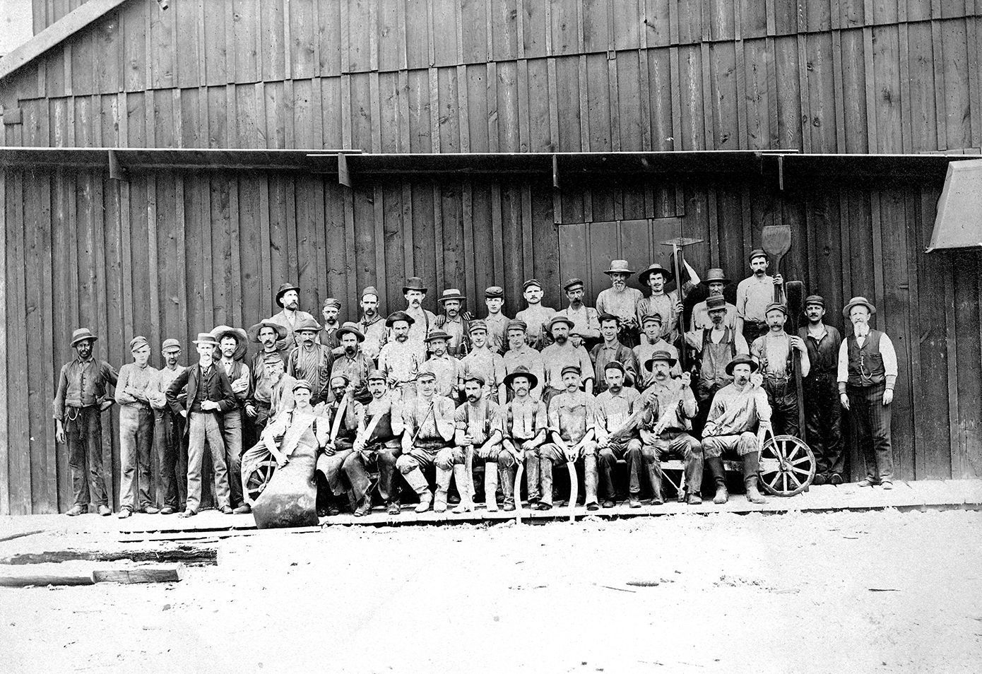 Black and white photograph of the Schlosser Tannery. The photograph shows the outside façade of the tannery with a large group of men, some holding various garden tools while others sit on a wheeled cart. The photograph is mount of cream matboard and has an overall measurement of 9.75"x 12.0".