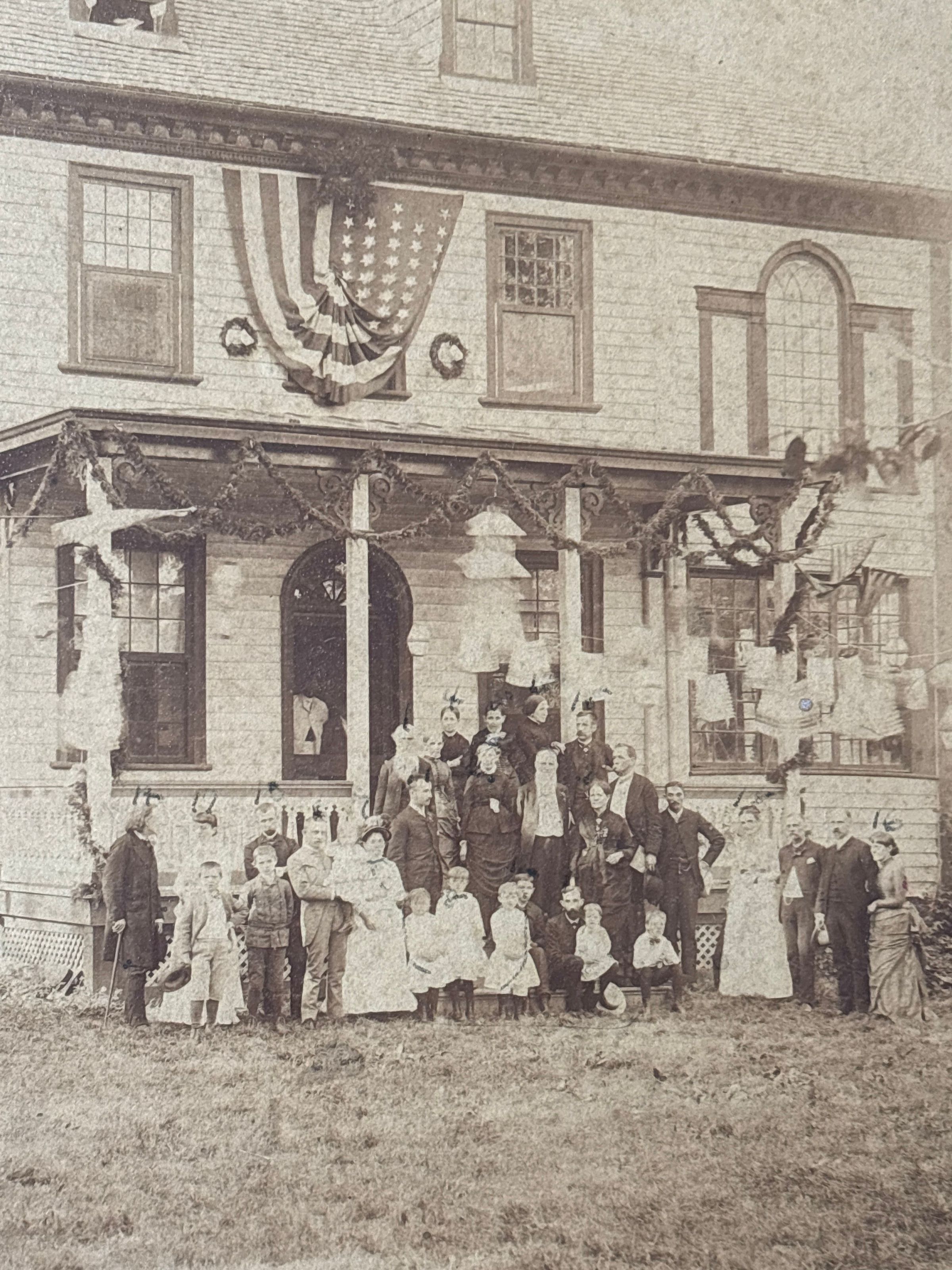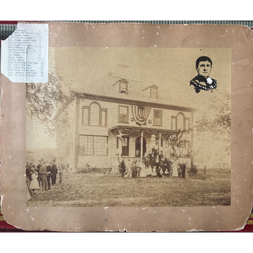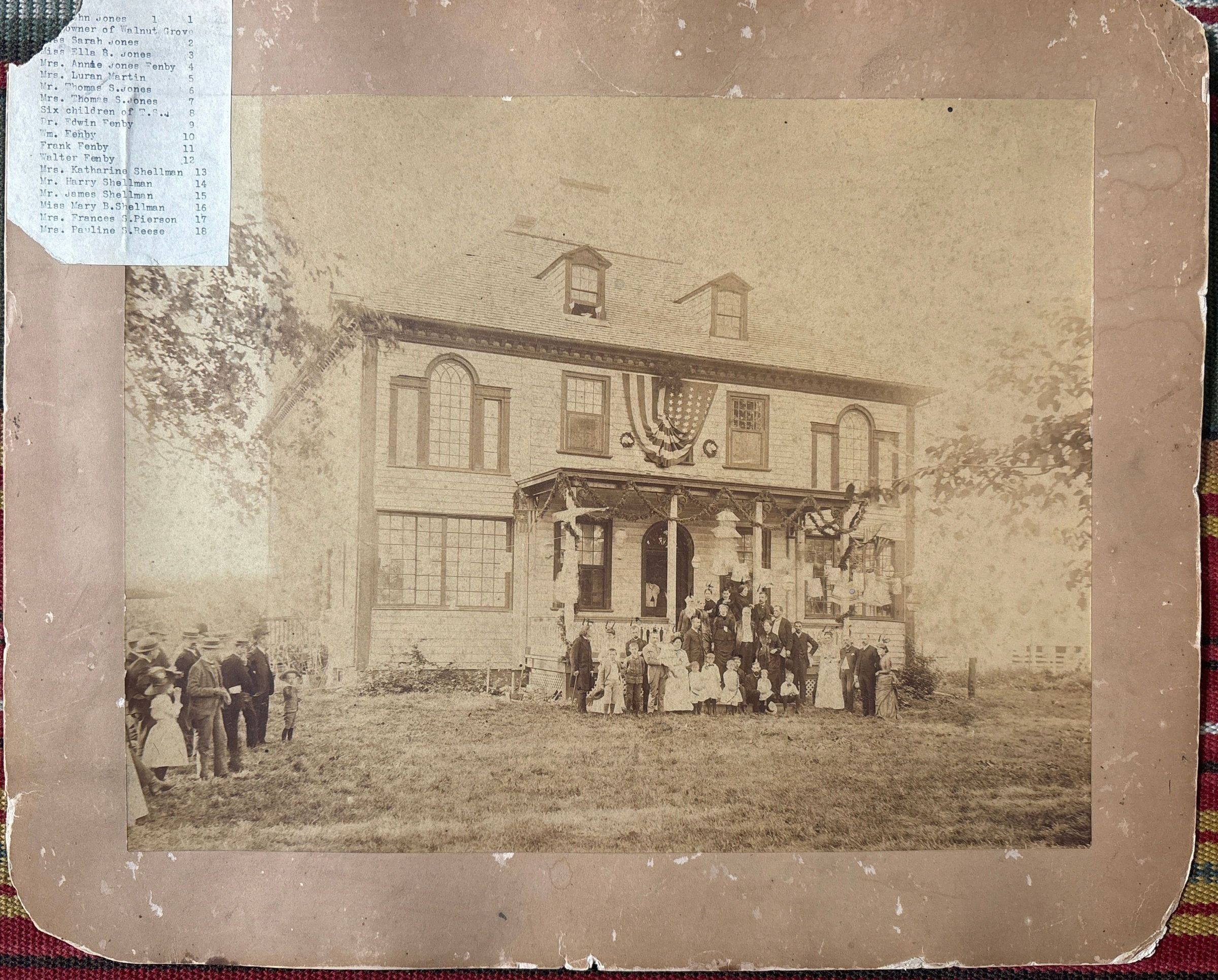 Print, photographic. Members of the Shellman family at Walnut Grove. Large white house with arched windows on the second floor and projecting front porch. House is decorated with flags and bunfing. Family members are standing on the porch and lawn. Numbers have been written on family members; paper glued to upper proper right corner has typed list of names. ___ John Jones 1; owner of Walnut Grove; Miss Sarah Jones, 2; Miss Ella S. Jones, 3; Mrs. Annie Jones Fenby, 4; Mrs. Luran Martin, 5; Mr. Thomas S. Jones, 6; Mrs. Thomas S. Jones, 7; six children of T.S.J., 8; Dr. Edwin Fenby, 9; William Fenby, 10; Frank Fenby, 11; Walter Fenby, 12; Mrs. Katherine Shellman, 13; Mr. Harry Shellman, 14; Mr. James Shellman, 15; Miss Mary B. Shellman, 16; Mrs. Frances S. Pierson [Pearson], 17; Mrs. Pauline S. Reese, 18. Mounted on tan board. Photographer's label on back reads: "_____ Robinson Photographic Art N.E. Cor Eutaw & Lexington Sts. Baltimore, Md." Overall size 14" x 17"; image size 10.75" x 13.75". August, 1886.Context