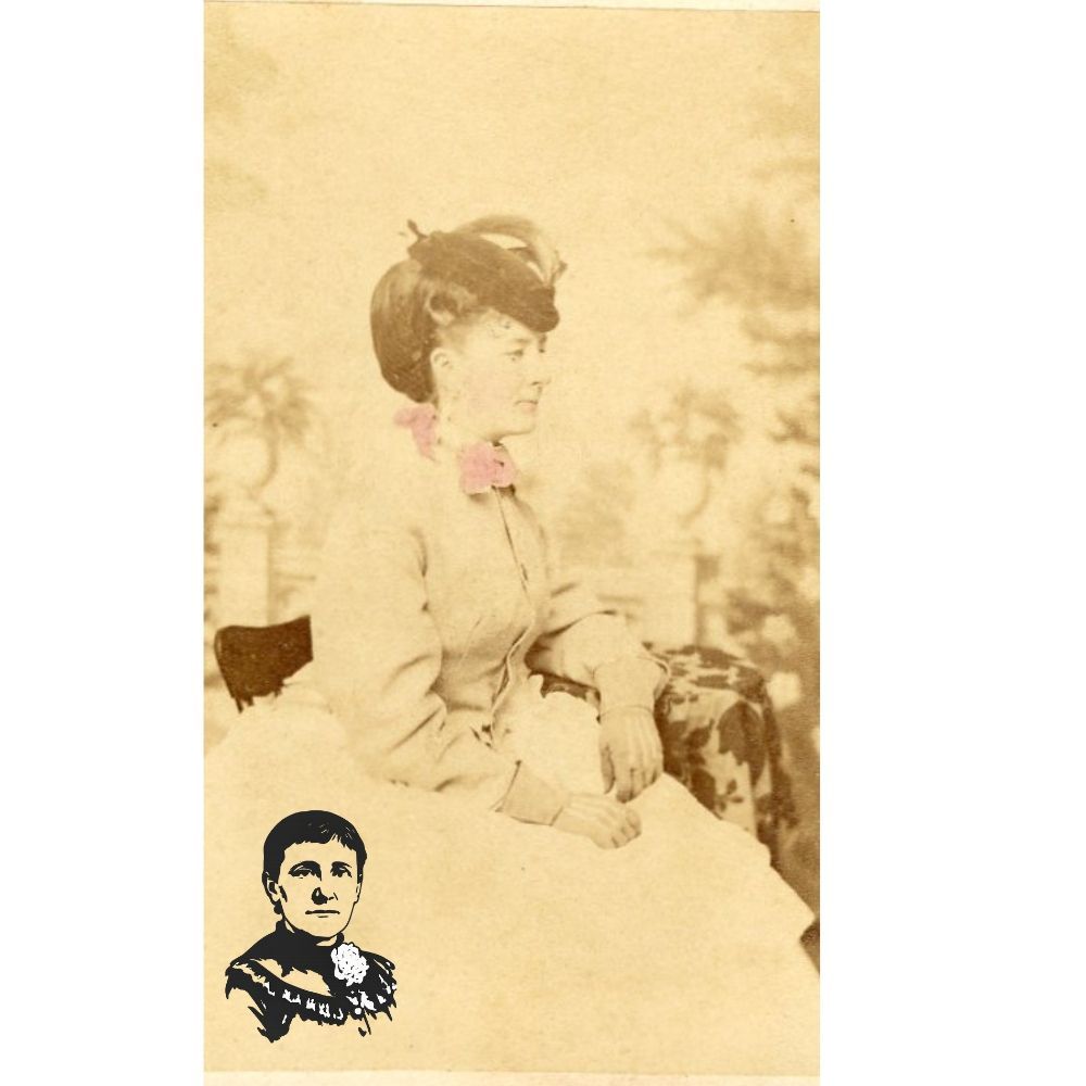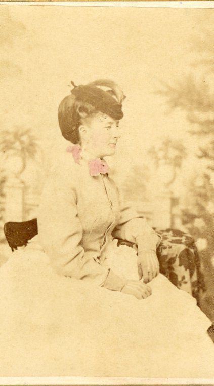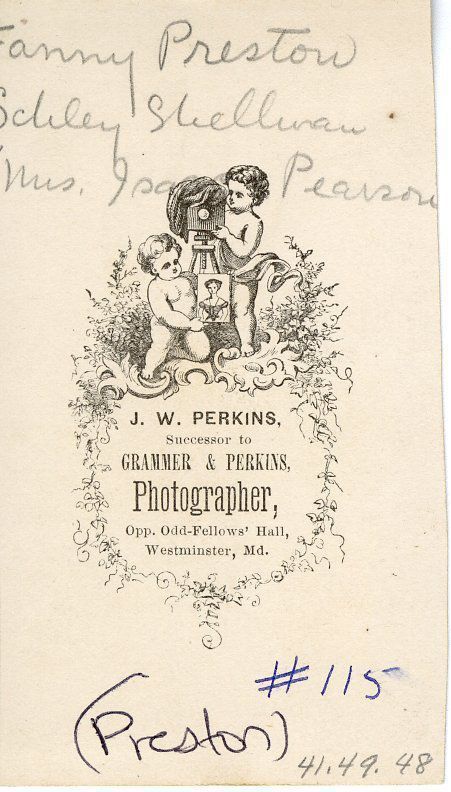 Carte-de-visite. Image of Fanny Shellman by photographic studio "J.W. Perkins, Successor to Grammer & Perkins, Photographer, Opp. Odd-Fellows Hall, Westminster, Md." Undated. Reverse side labeled "Fannie Preston Schley Shellman, Mrs. Isaac Pearson." No explanation for name "Preston" on this photograph. Three-quarter length portrait of seated woman in light-colored dress wearing a hat. Pink tint on scarf(?) at her neck. Photograph slightly trimmed on one side. 4" x 2.25".Context