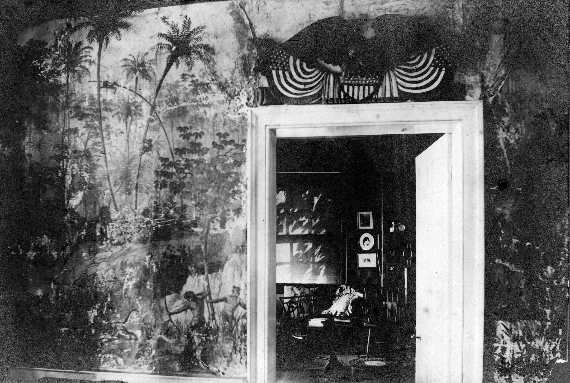 Print, photographic. Image of interior of Shellman House, Westminster, Md. By Mitchell’s Art Gallery, Westminster, Md. Undated. Reverse side labeled "Hist. House." Photo shows hallway with elaborate Zuber wallpaper and large patriotic decoration with eagle and flags over doorway into interior room. Overall size 8" x 10"; image size 4.5" x 7".Acquisition