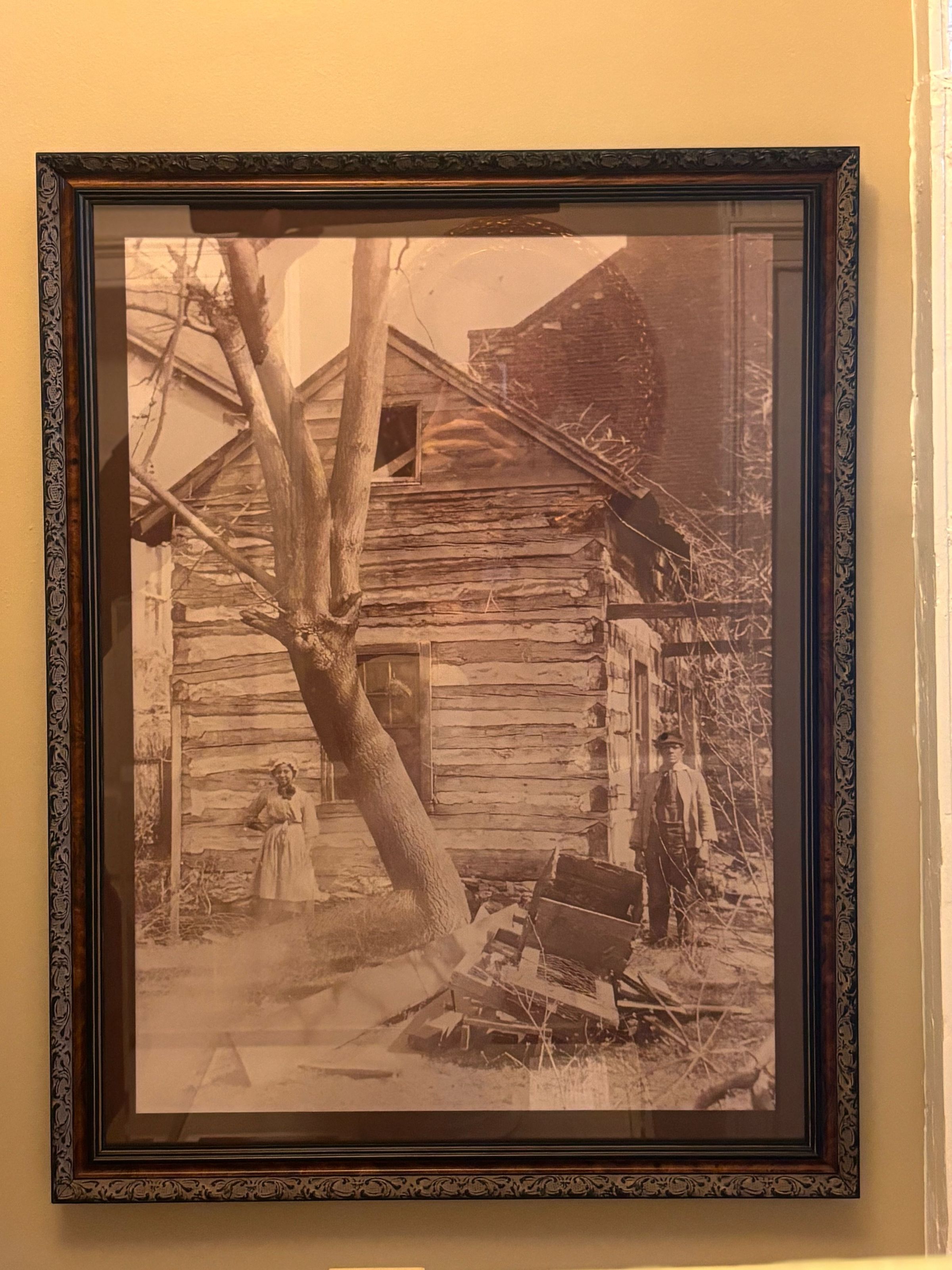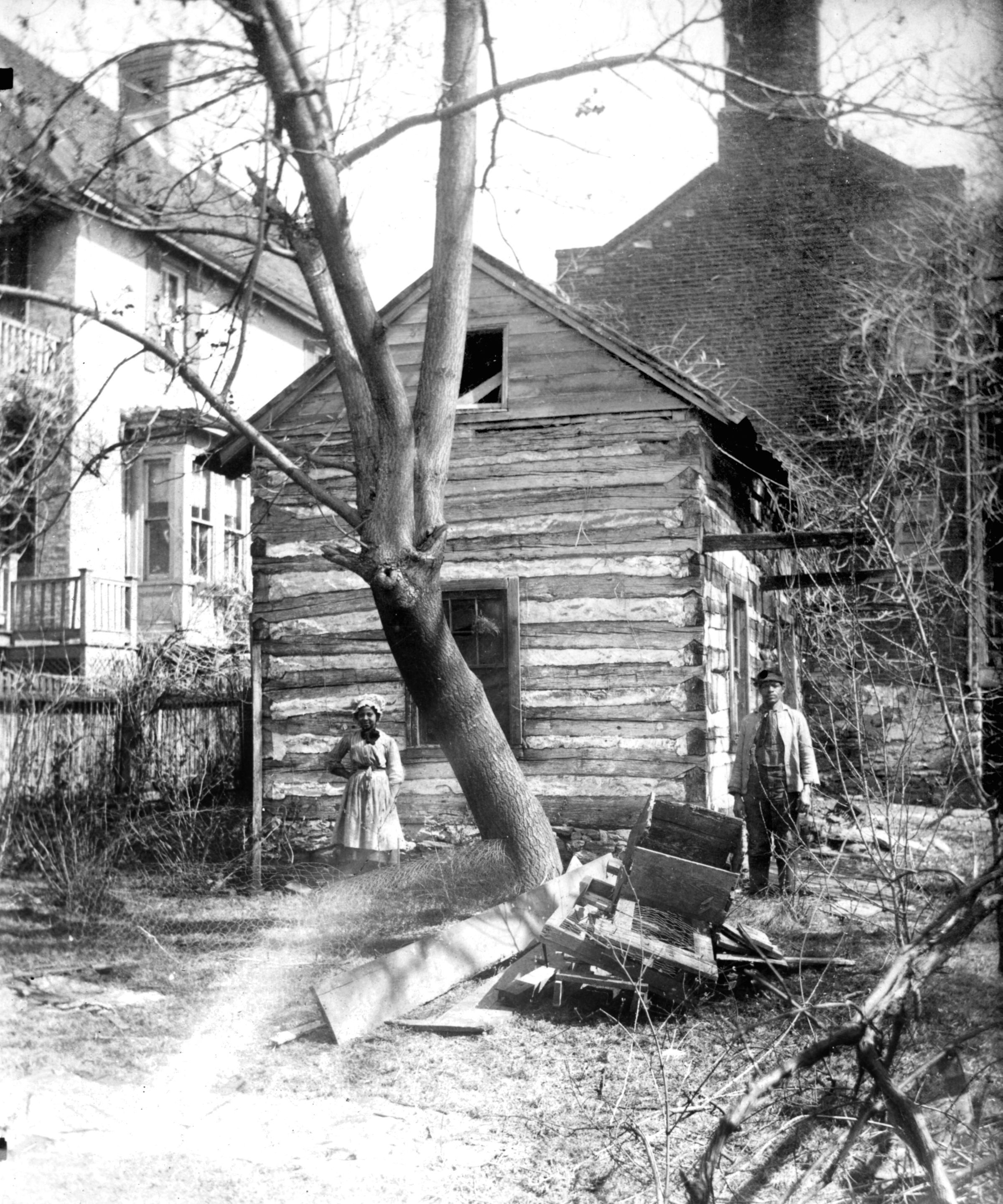 Print, photographic. B/W photograph of the log loom house in the yard behind the Shellman House. An African American couple are standing in front of the building. c. 1900Context