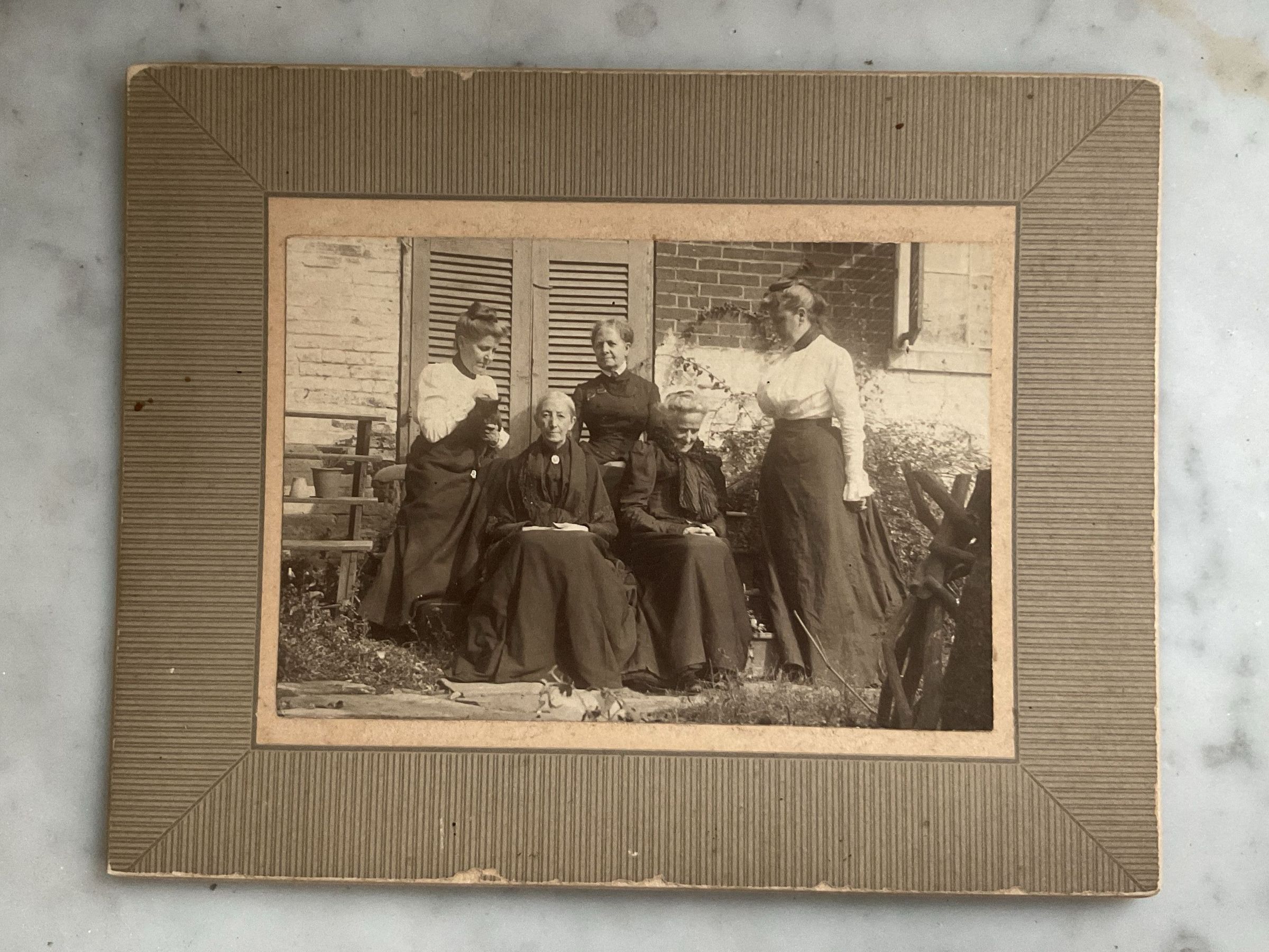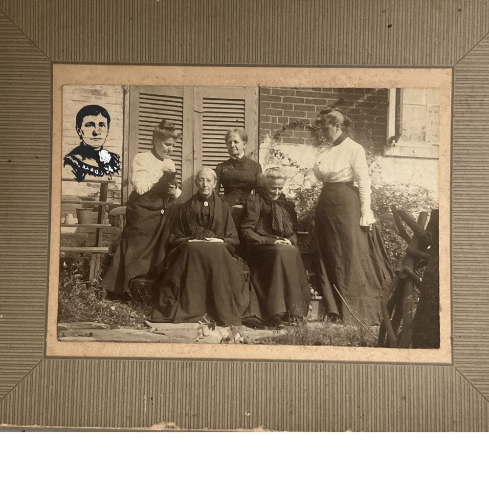 Print, photographic. Image of Mary B. Shellman, Sarah Eliza Jones, Ella R. Jones, C___ Kimball and Fanny C. S. Shellman Pearson by unknown photographer. Undated. Reverse side labeled "’A gathering of the fossils’ - Mary Bostwick Shellman & 19 yr old cat ‘Col. Black,’ Westminster, Md., Cousin Sarah Eliza Jones, ‘Walnut Grove,’ Cousin Ella R. Jones, ‘Walnut Grove,’ old Homestead, Patapsco Neck, Miss Cl__ Kimball, Baltimore Md., Fanny C. S. Shellman (Pearson), Westminster, Md. Shellman back yard." Full-length posed photograph of 3 older women in dark, high-necked dresses with the two Shellman women in white blouses and dark skirts. Some subjects seated, some standing. Overall size 4.5" x 5.75"; image size 2.75" x 4".Acquisition