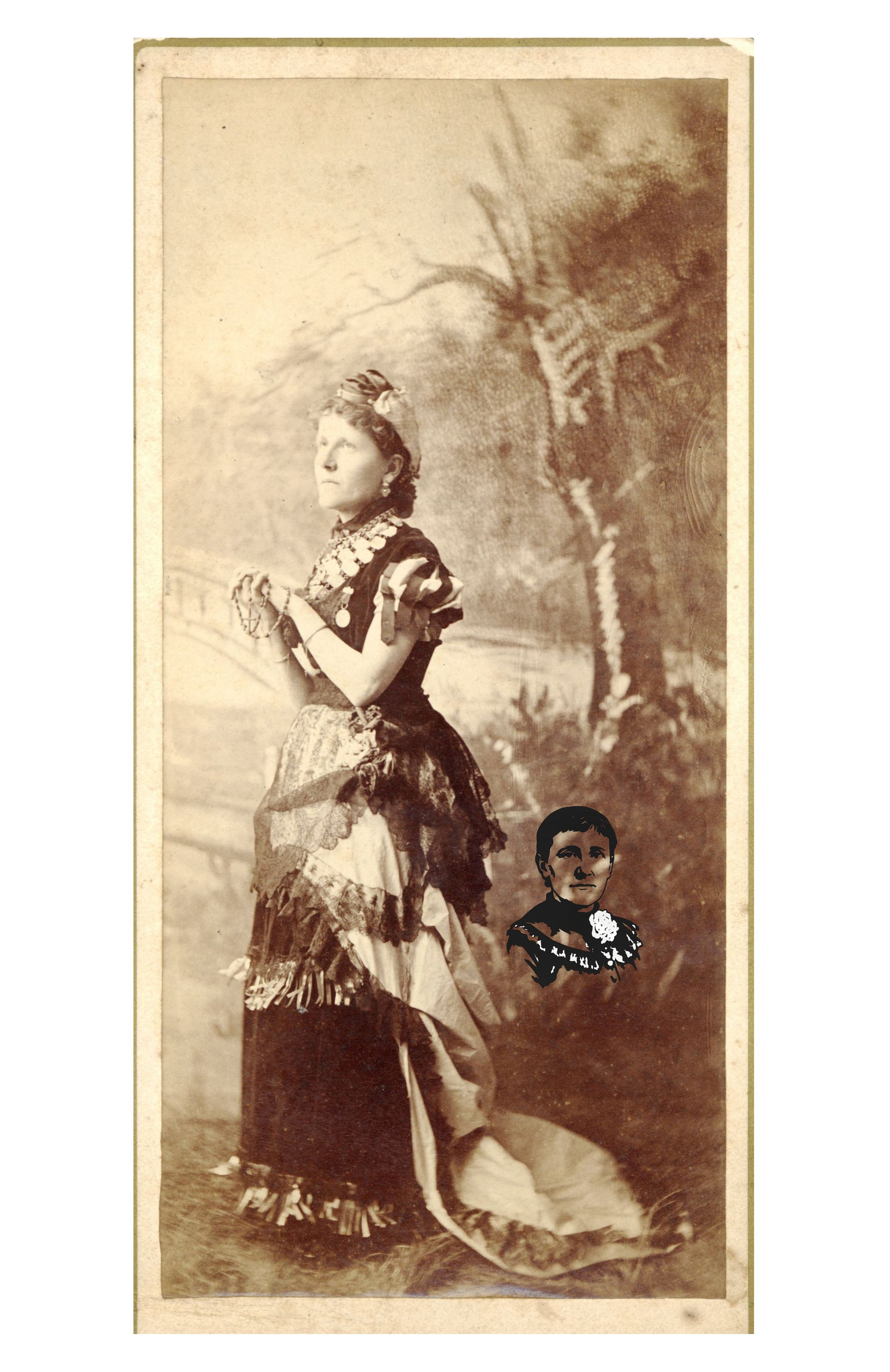 Print, photographic. Image of Mary B. Shellman by photographic studio Chas. W. Knight, Main Street, Westminster, Md. Opposite Catholic Church. Undated. Reverse side unlabeled, but photograph obviously taken at same time as 41.49.67 in April, 1881. Shows Mary B. Shellman as Princess Anabella in Drama of Julian. Irving Literary Society, Odd Fellows Hall. Full text of photographer’s label reads "Old pictures of deceased persons copied in an artistic style. Chas. W. Knight, Main Street, Westminster, Md. Opposite Catholic Church. Copies of this picture may be had at any time by sending name and time of sitting." Full-length view of Mary Shellman seated in costume with fanciful backdrop. Photo mounted on cardboard in manner of cabinet photograph. 8" x 4".Acquisition