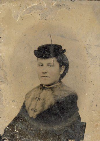 Tintype. Image of Mary B. Shellman by unknown photographer (information with name of photographer worn away). Dated "1860’s." Reverse side labeled "1860’s." Embossed cream-colored cardboard with oval opening for insertion of tintype. Head and upper torso of young woman wearing a small hat. 4" x 2.25".Acquisition