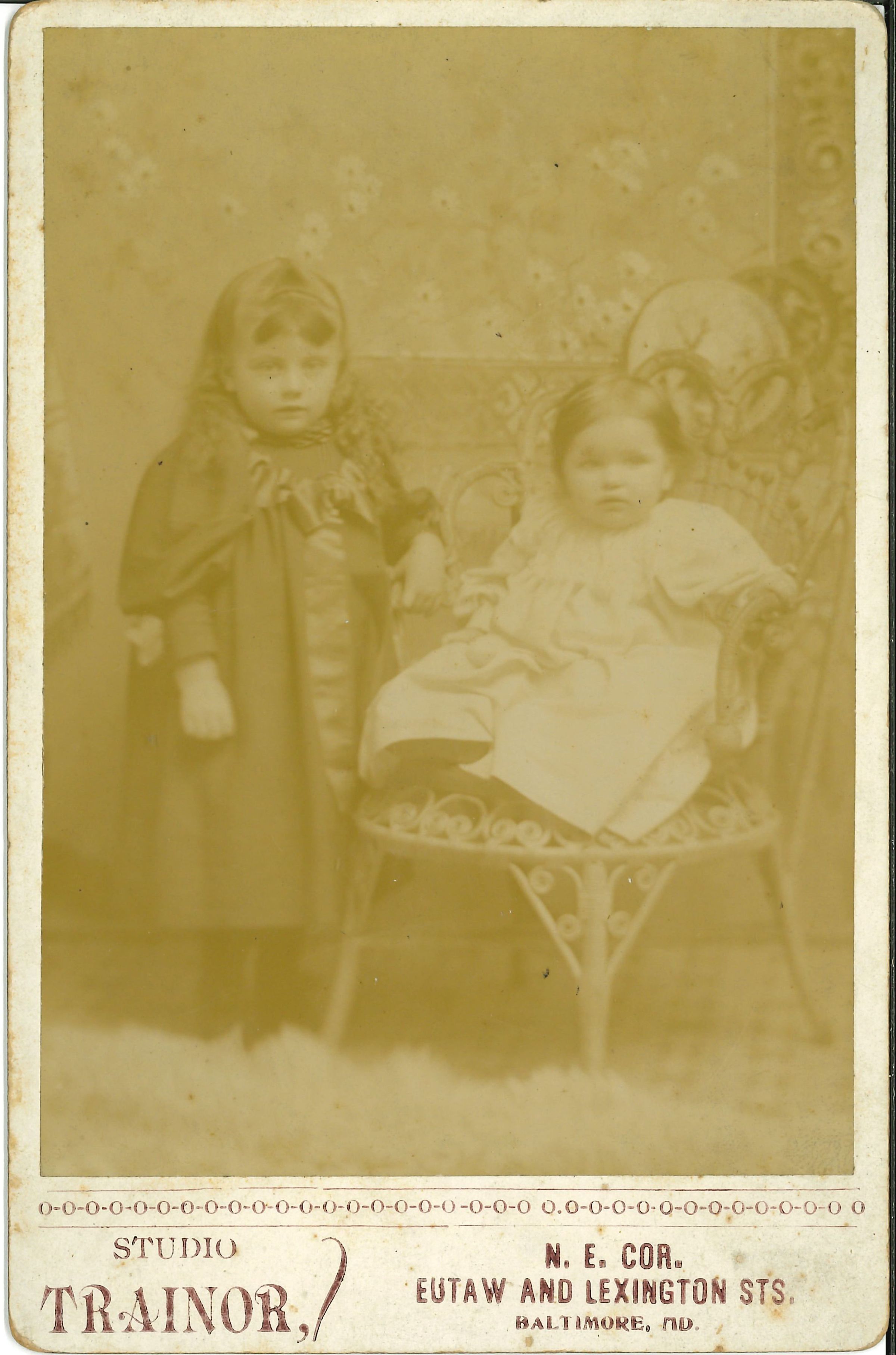 Print, photographic. B/W studio portrait of two very young girls. Older girl standing, wearing dark dress. Younger girl seated in chair, wearing white dress. Written on back in ink: Florence Shorb; Olive ".Photograph Details