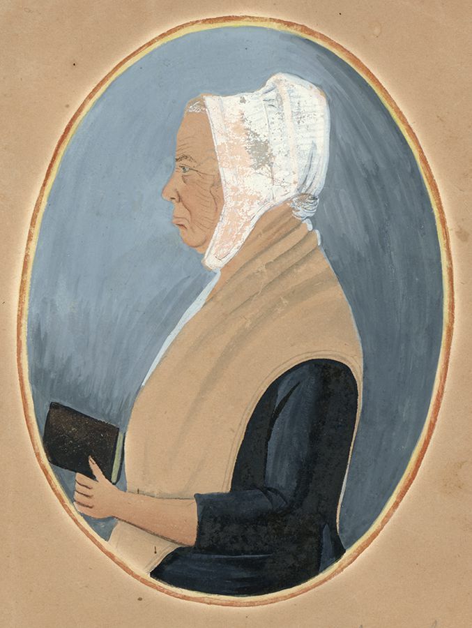 Painting, watercolor and ink on light brown paper, 10" x 7.875", oval portrait of Mrs. David (Rebecca Ferree) Shriver, Sr. (1742-1812) facing right proper edge, pigments used include blue, black, red, and yellow, details on face and hair in ink, handwritten mark in pencil at bottom reads "Wife of David Shriver / Pipe Creek", different handwritten mark in pencil reads "Rebecca de Fere / of / Piquer, Lancaster Co. Pa.", probably by Maentel, probably Lancaster Co., Penna., c. 1800.Acquisition