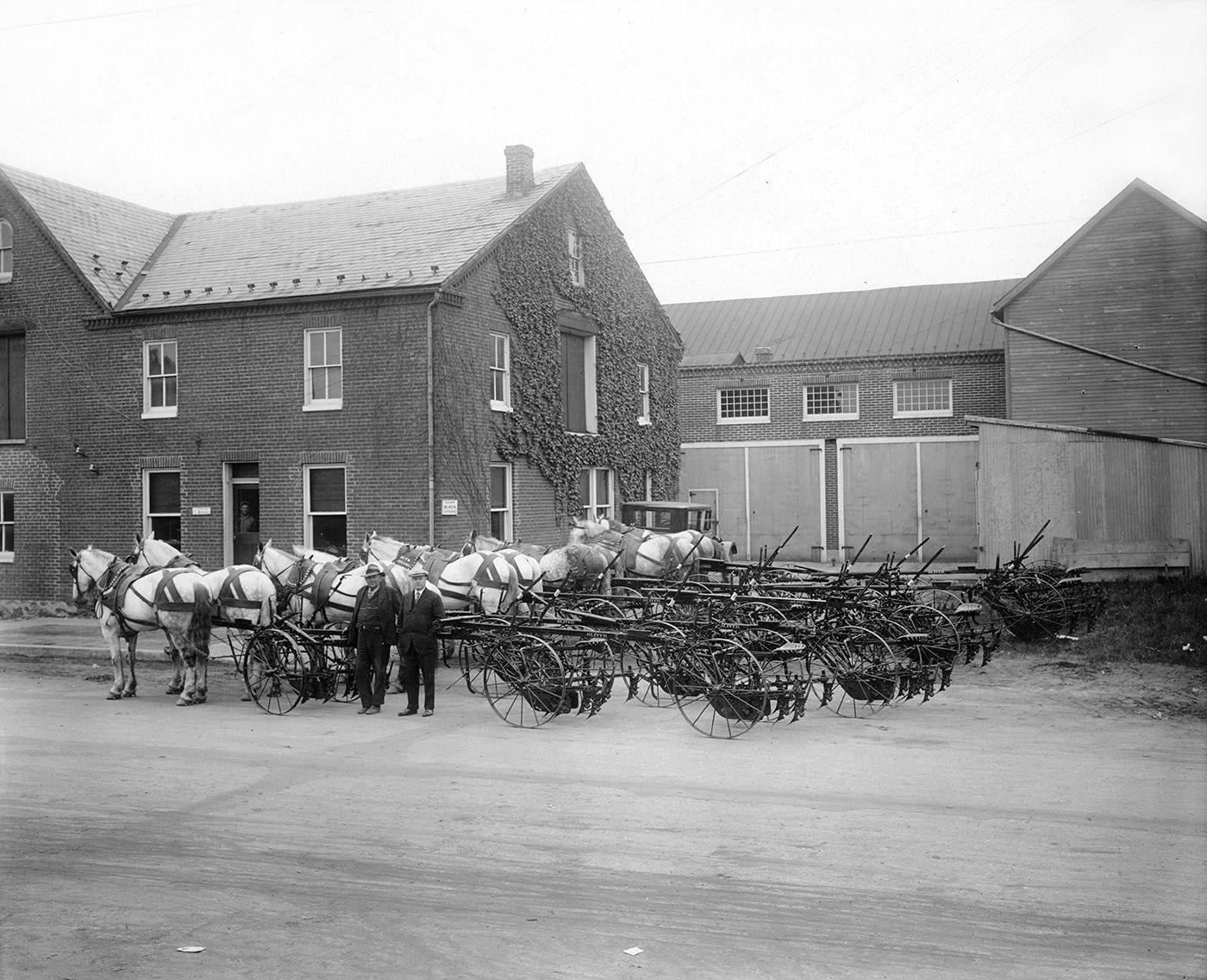 Print, photographic. B/W photograph of the Smith-Yingling Canning Company, Railroad Ave., Westminster, 1927. Shows 2 brick buildings and a small wood shed; in the yard are 6 pairs of white draft horses, each pair hitched to an Oliver furrow plow. Two men are standing in front of the equipment: Clarence Barnes, farm manager, and Robert K. Billingslea, Sr., president. Written on back in pencil: Wilson Studio. 7.875” x 9.75”Acquisition