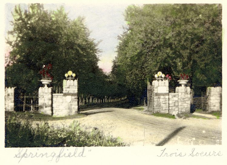 Print, photographic. B/W photograph, hand-tinted, showing the entrance to a Springfield Hospital. Road runs between two stone columns, each topped with a 3-globe light fixture; there is a second, smaller, column to the outside of the larger columns; each smaller column is topped with an urn filled with flowers. Titled "Springfield" in pencil below image. Signed in pencil "Trois Soeurs". Overall size 4" x 5"; image size 2.375" x 3.625". Was framed in 2012.11.4.Acquisition