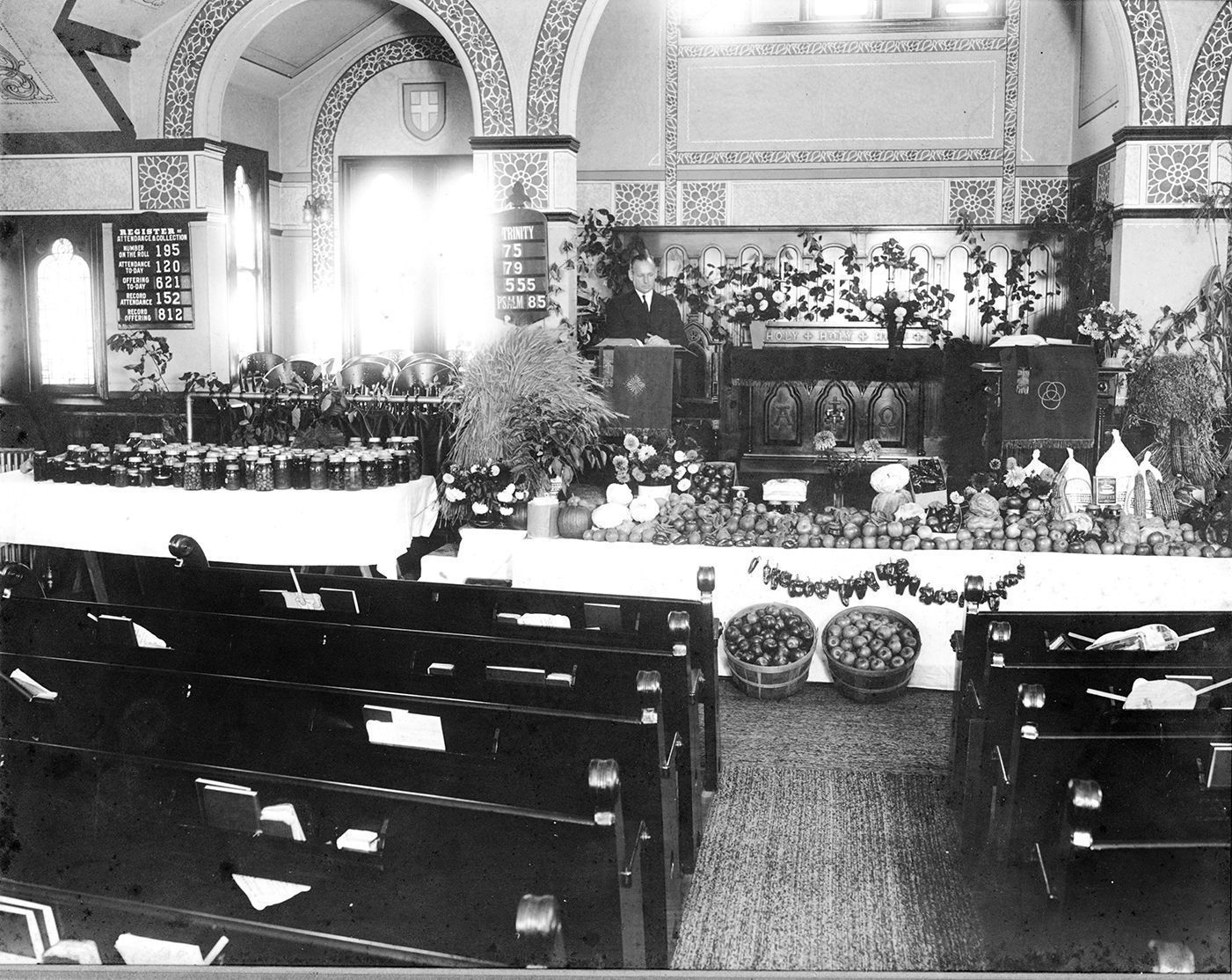 Man in the photo may be Rev. J.E. MacDonald who was pastor of the church from 1930-1941"Harvest Home" was a Pennsylvania German tradition to celebrate the end of the harvest season. The church was decorated with an assortment of foods. In the early years, the pastor received the food as part of his pay. In later years, the food was donated to needy families or groups.