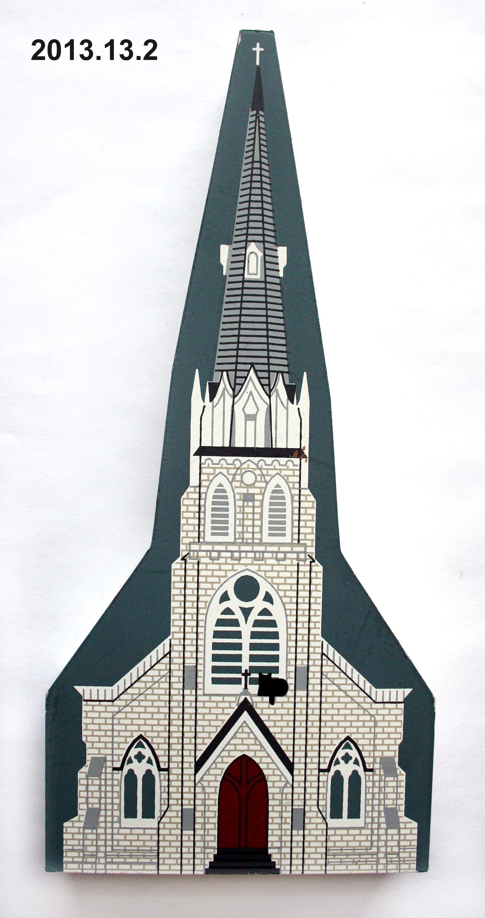Model. St. John Catholic Church, East Main Street, Westminster. Wood block cut to the outline of the building, painted to resemble the building. Marked on back: St. John's Catholic Church Westminster, Maryland Commissioned through "The Hickory Stick" © 1997 THE CAT'S MEOW. Signed "Faline 97" on back. 6.5" x 3" x .75".Acquisition