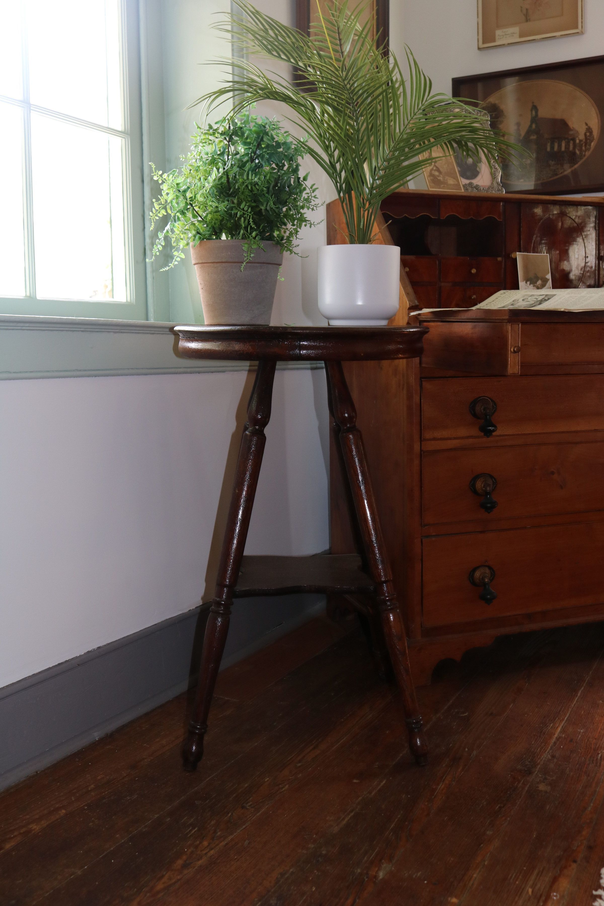 29"h x 16"w x 16"d. Round tabletop, four turned legs with square shelf (shaped edges) attached at midpoint. 1900-1920.