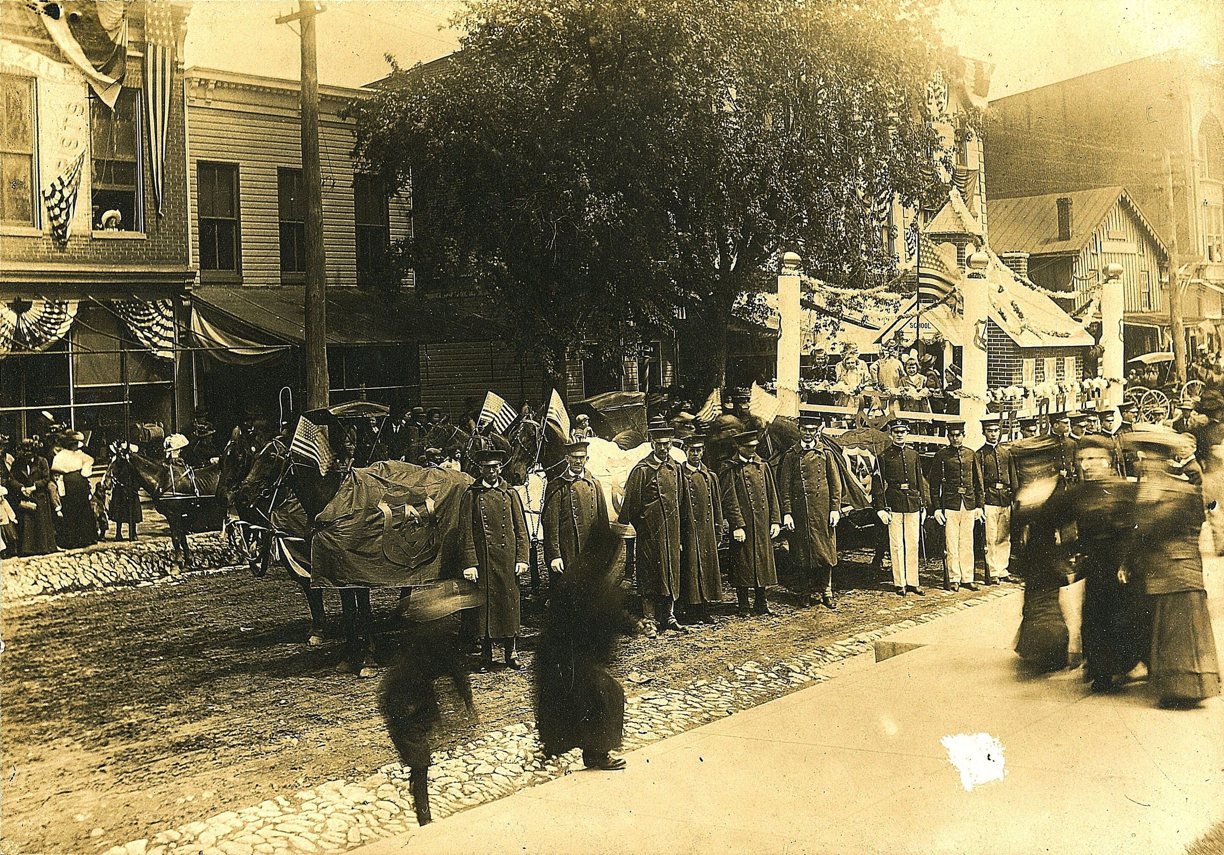 Print, photographic. State Firemans Convention Parade, Westminster, Junior Order United American Mechanics Float. B/W photo. There is a team of horses wearing blankets with a crest on them and small American flags tucked into their tack. The horses are pulling a large float with four columns. There are children standing on the float. Along the side of the float is Jr. O.U.A.M. and crests on all of the columns. There are six men in long coats posed in front of the horses, eight young men in what appears to be military uniforms and posed next to the men in the long coats. There are people all along the streets watching the parade. There are American flags and bunting decorating the buildings along the street. On a black mat marked "Mitchell' Art Gallery Westminster, Md." On back in black ink "Jr. O.U.A.M. float"; in pencil "Firemans Convention Westminster Harry Koler donor". Overall size 8" x 10"; photo 4.75" x 6.75"Acquisition