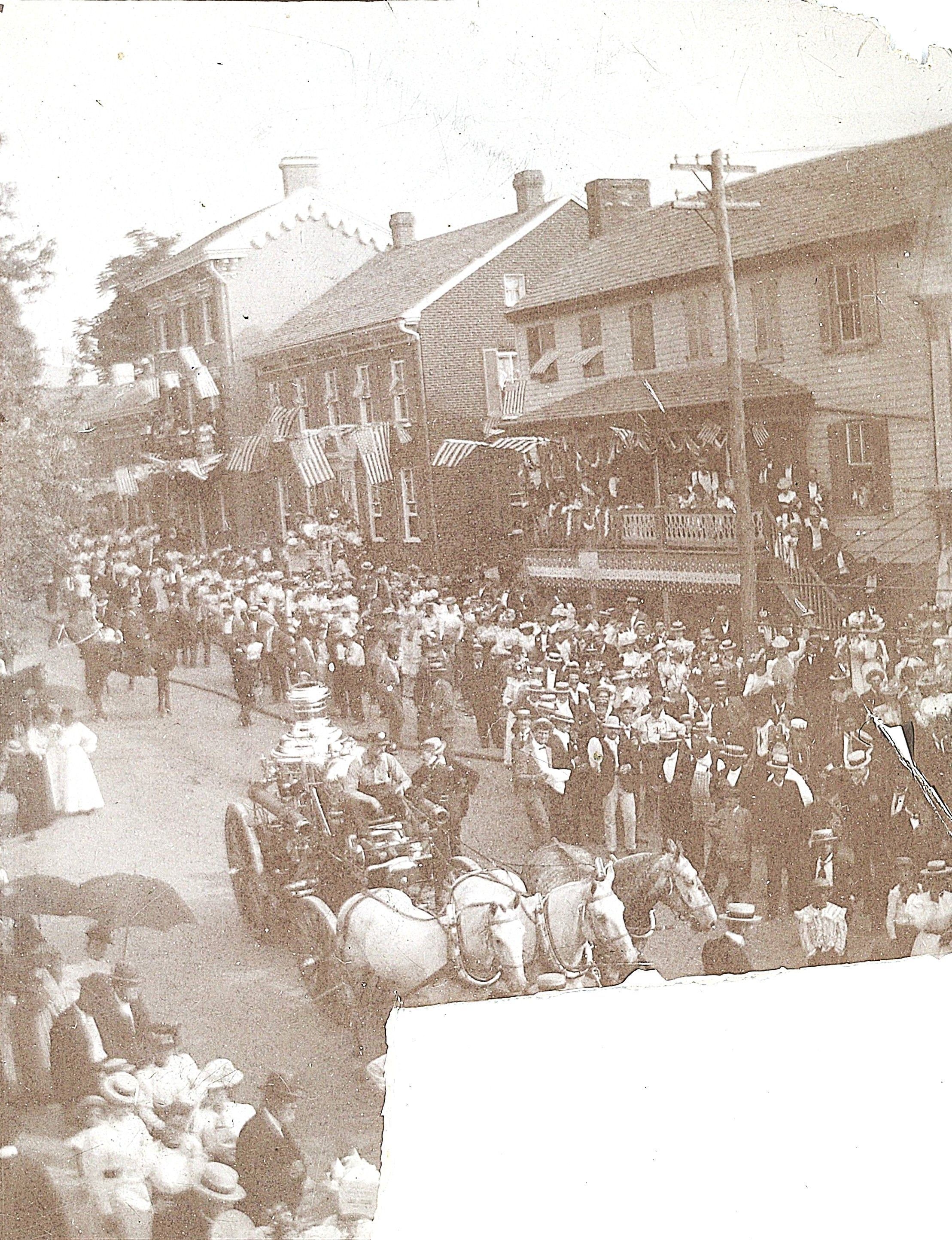 Print, photographic. State Firemen's Convention Parade, Westminster, Crowd. B/W photo. There is a huge crowd gathered along the sides of the street with an open space down the center, small groups are walking down the street and there is an old fashioned fire pump being led by two horses. There are three houses visible along the right side of the road. There are American flags and bunting decorating all of the downtown buildings. On back in black ink "Mrs. W. Frank Thomas, donor 6/29/54 East Main St." 3.75" x 5"