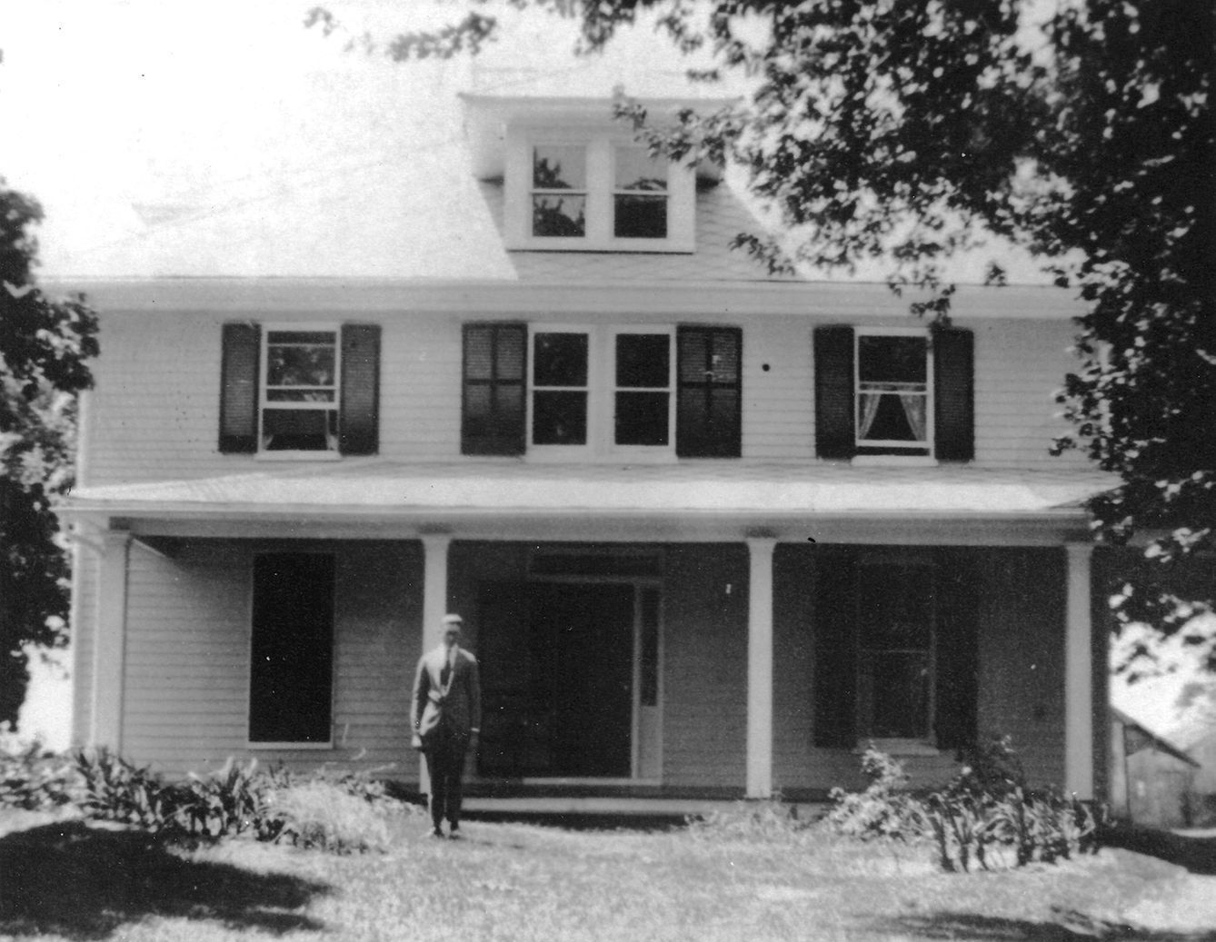 print, photographic. B/W photograph of the two-story home of Dr. Stephens in Eldersburg. In front of the home stands a man in a suit. The house has a full length front porch with a light colored façade and dark shutters. 4" x 5".Acquisition