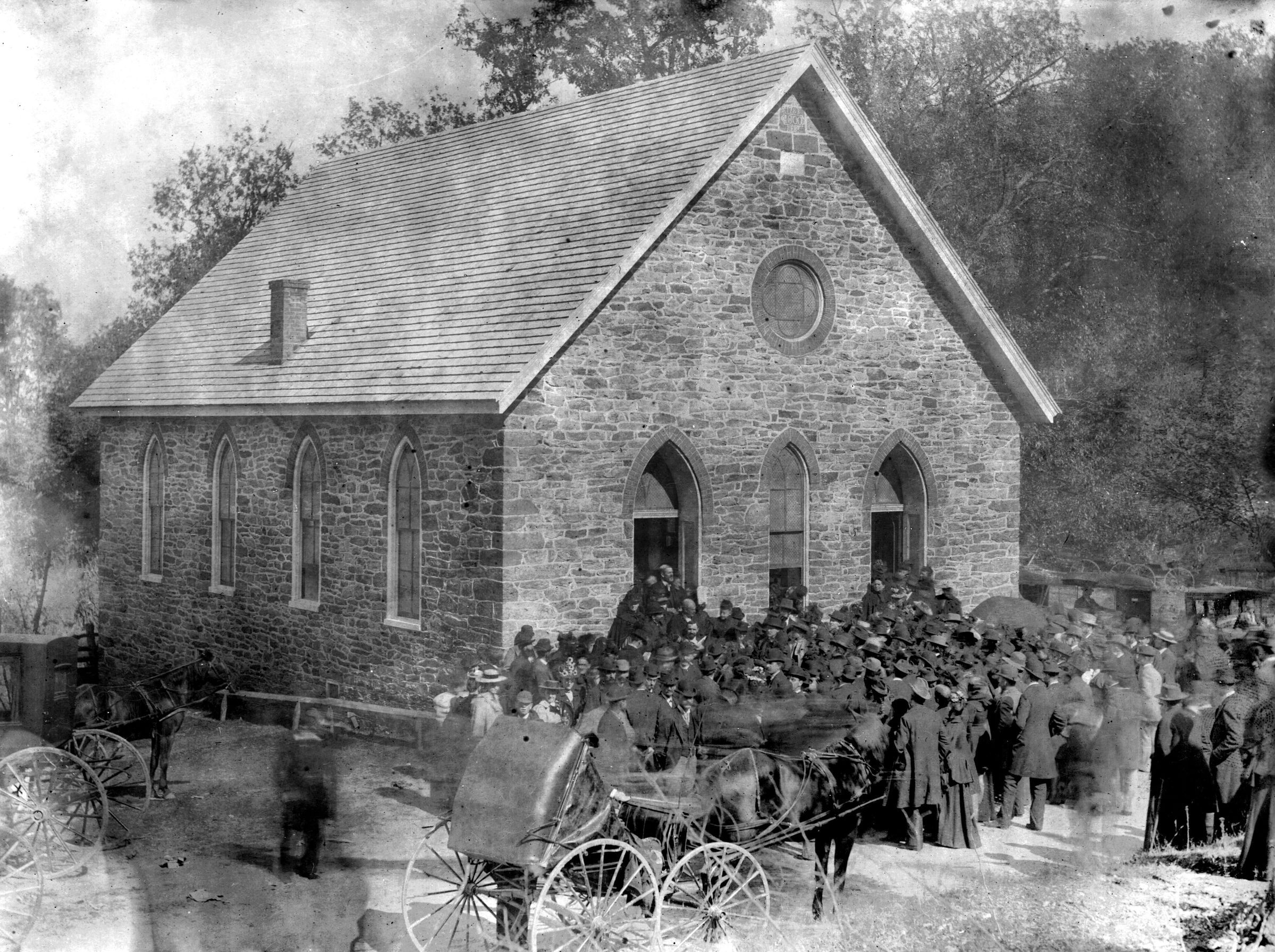 Print, photographic. B/W silver gelatin print mounted on board, 8" x 10". Image measures 6" x 8"; shows the exterior of the Stone Chapel with a large group of people outside the church. Written on back is "Stone Chapel."Acquisition
