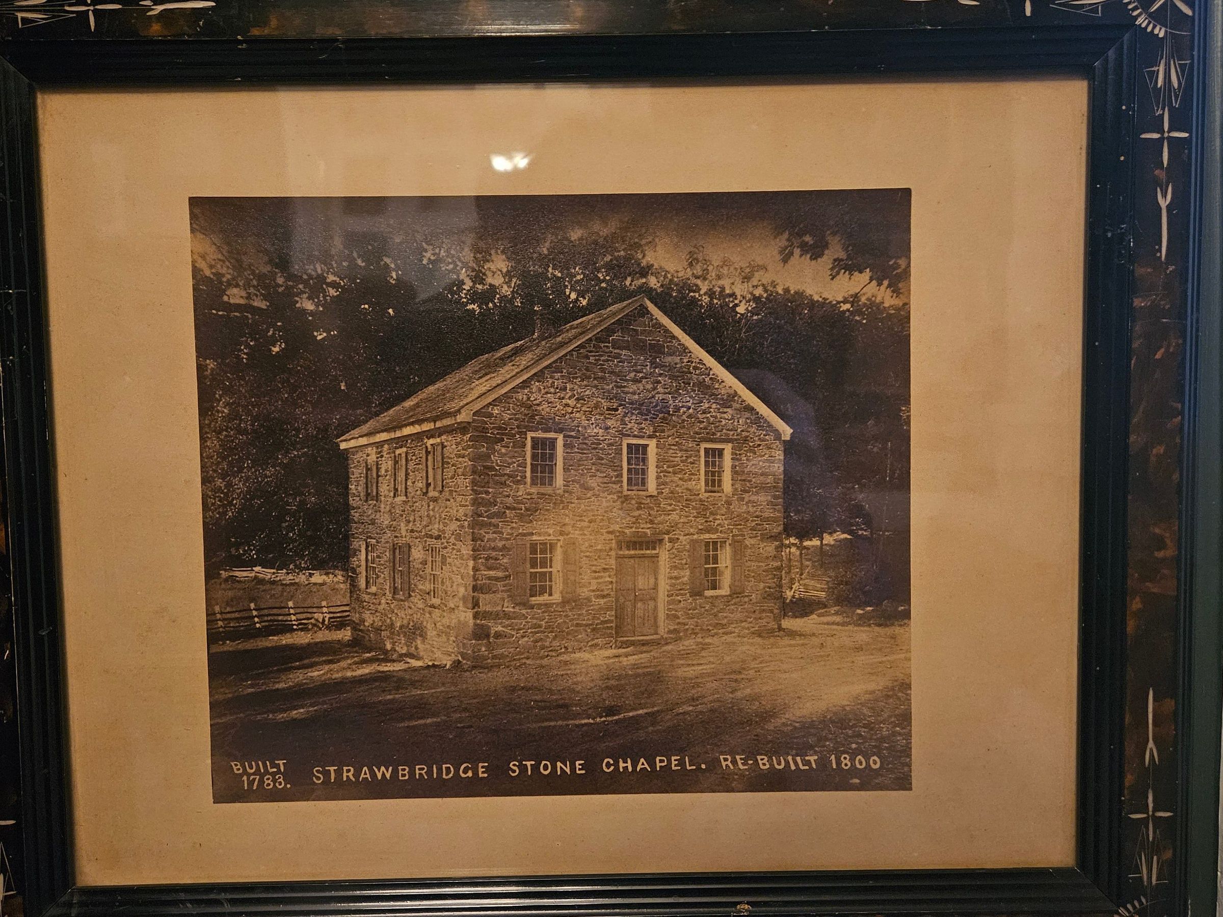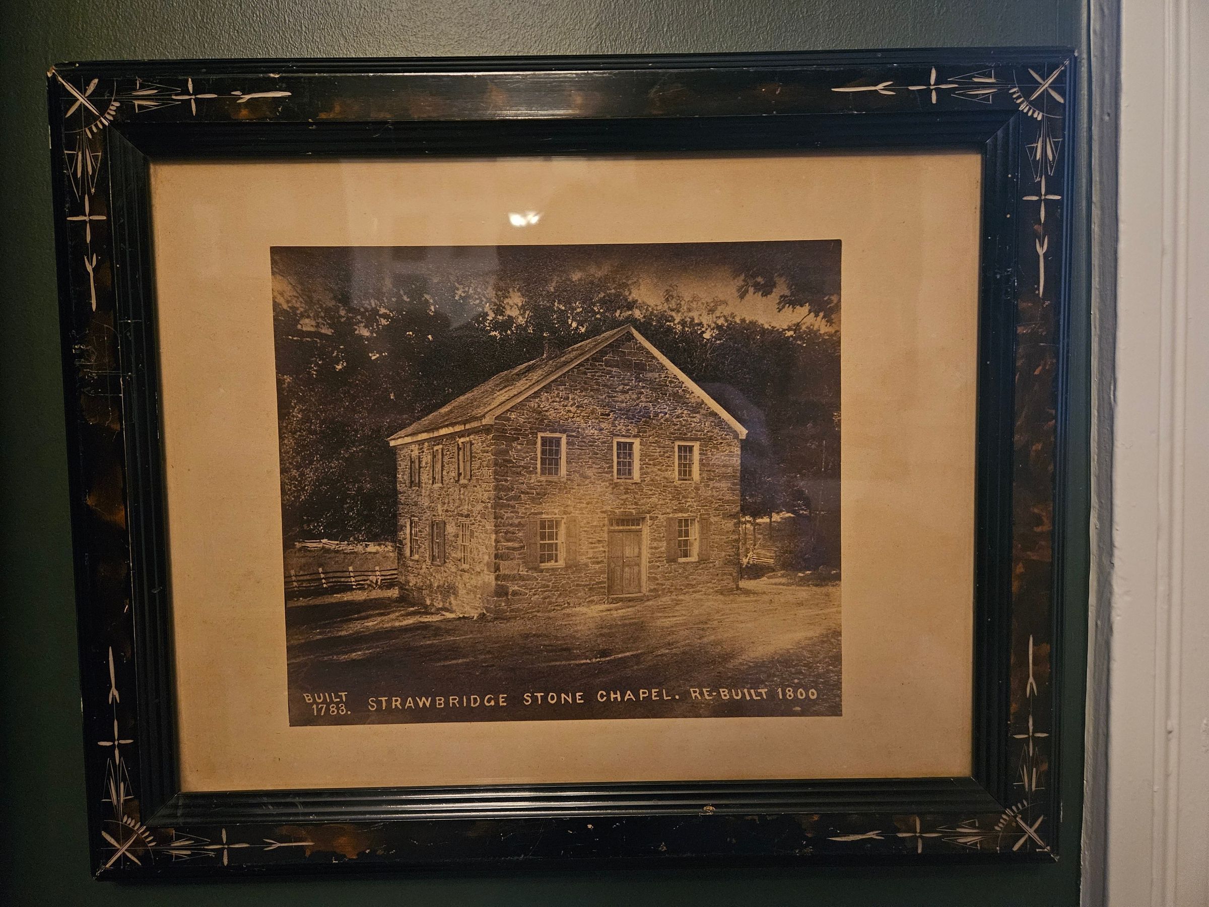 13.5"h x 16.5"w x 0.75"d. Rectangular, wood and gesso frame, painted black/brown with carved designs. Image of two-story stone building with double doors on front. Caption reads "BUILT 1783. STRAWBRIDGE STONE CHAPEL. REBUILT 1800." Stencilled on back: "J.W. LAWRENCE PICTURES AND FRAMES CORNICES MIRRORS 338 W. BALTIMORE ST."