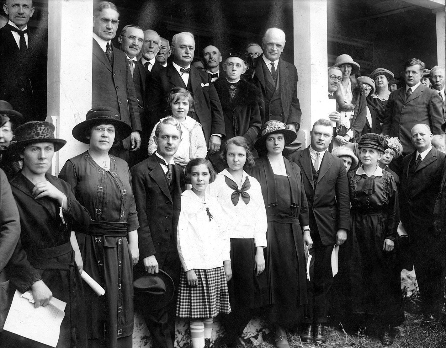 Print, photographic. B/W photo on the porch of the house on the Manro Farm, Friday, September 29, 1922, when the farm was presented to the Baltimore Conference of the Methodist Episcopal Church by Mr. and Mrs. George W. Albaugh, of Westminster, Maryland, for a Boys' School and Home and accepted by Bishop McDowell. Top row. left to right —Revs. E.T. Mowbray, J.M. Gillum, Supt. Baltimore district, J.F. Heisse, Joel Brown, C.W. Baldwin, W.C. Harden and D.E. Moylan, Bishop W.F. McDowell, F. Chipley of Sykesville; Mrs. Harry M. Kimmey, Mrs. Samuel Engleman, Miss Addie Manahan, and Guy W. Steele. Center, left to right—Mr. George W. Albaugh, his granddaughter Margaret Gillelan, Mrs. George W. Albaugh. Bottom row, left to right—Mrs. Wicks, Mrs. Carroll Albaugh, Mr. Carroll Albaugh, Ruth Gillelan, Elizabeth Gillelan, Mrs. Robert K. Billingslea, Mr. Robert K. Billingslea, Mrs. Charles E. Goodwin, Bessie Reay, assistant editor of the Christian Advocate, and Rev. J.G. Field of Wesley Chapel M. E. Church, and “others.” The photograph is mounted and matted and measures 11.4"x 13.5". The image size is 7.5"x 9.5". In the lower proper left corner, the maker's mark reads, "Wilson Studio, Westminster, MD".