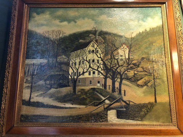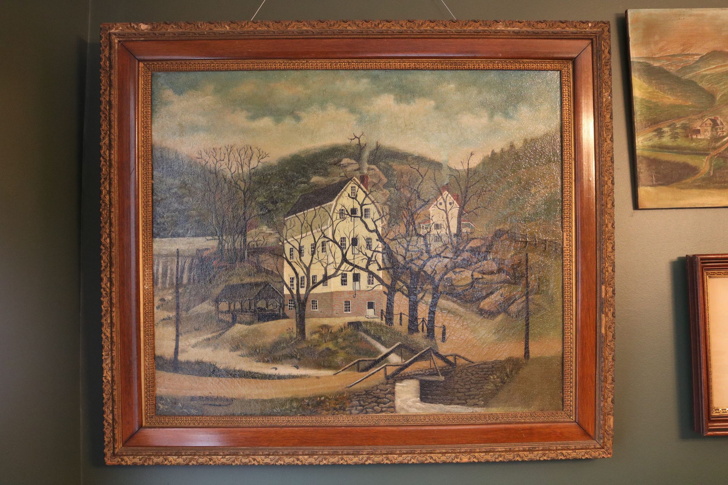Painting, oil. Painting shows a large white mill scene along a creek with a small iron bridge in the foreground. Painted by local artist Elmer Bloomfield Stubbins (1868-1942), with “E. B. Stubbins” signed on the lower left of the painting. Framed in a large wood frame with ornate gold detailing.
