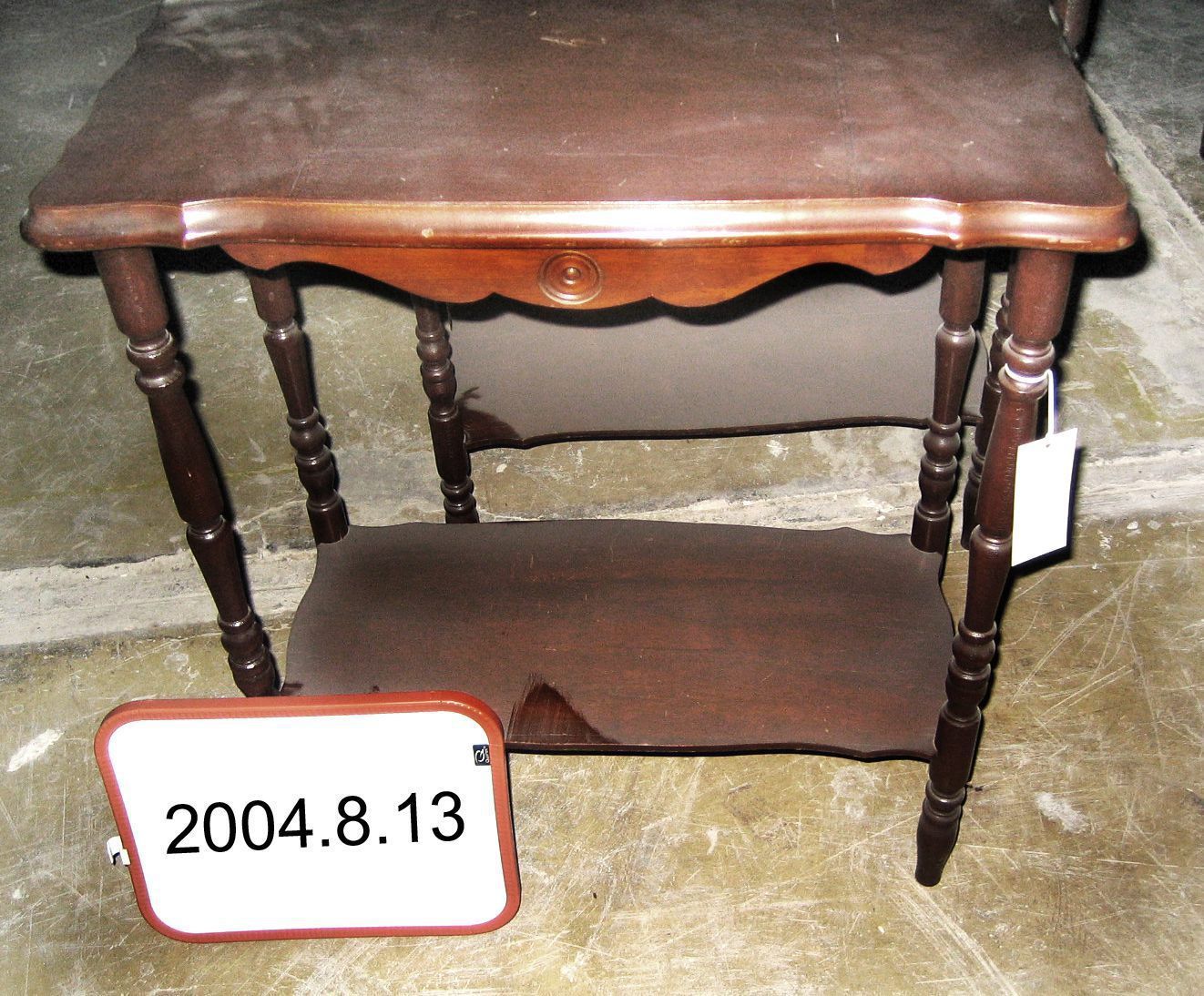 Table. A, B. Pair of small side tables. Rectangular; turned legs; low shelf between legs has scalloped edges; shallow apron below front of top; top has scalloped edge and is decorated with two thin bands of herringbone inlay runnin from front to back. No maker's marks. 23.5" x 22" x 11". C.1890.Acquisition