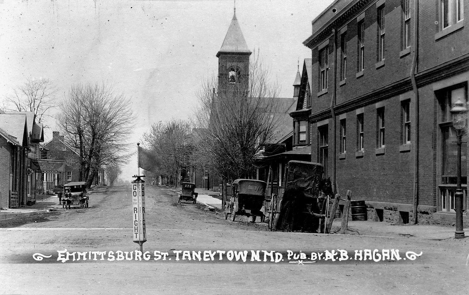 Black and white photograph of Emmittsburg St. in Taneytown, MD. The photograph is the front of a postcard showing the street lined on both sides with houses, businesses and churches. On the proper right side of the photograph there are two carriages parked alongside the curb in front of a brick building. In the middle of the road is a post that reads, "Go Right" in four thin panels. The postcard is not mounted or matted and measures 3.5"x 5.5".Postcard Details